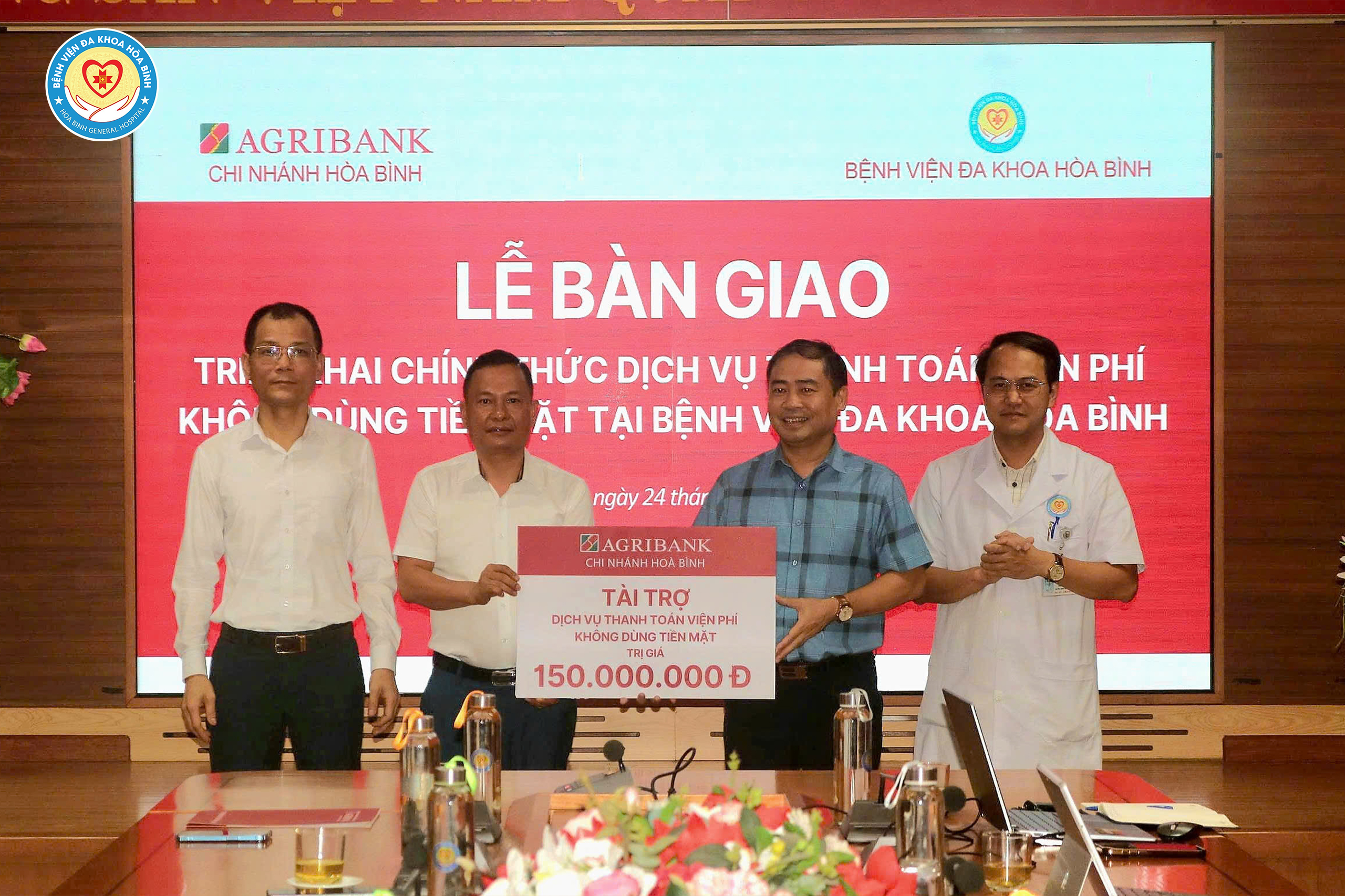 Tại buổi lễ, Agribank Hòa Bình đã bàn giao hệ thống dịch vụ thanh toán không dùng tiền mặt trị giá 150 triệu đồng cho Bệnh viện Đa khoa Hòa Bình.