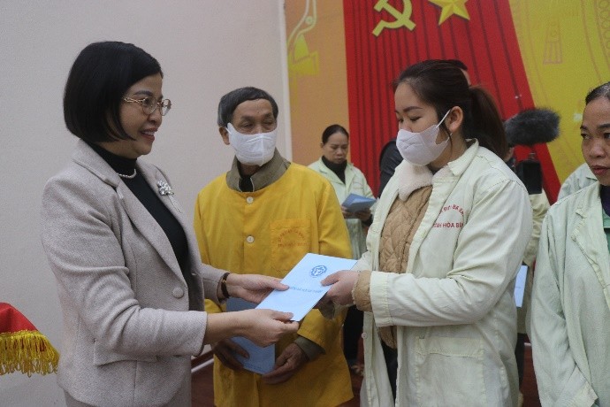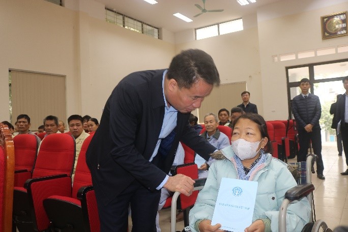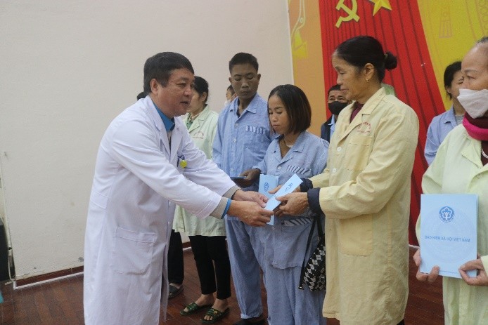 Tổng Giám đốc BHXH Việt Nam và Giám đốc Sở Y tế Hòa Bình trao quà cho các bệnh nhân