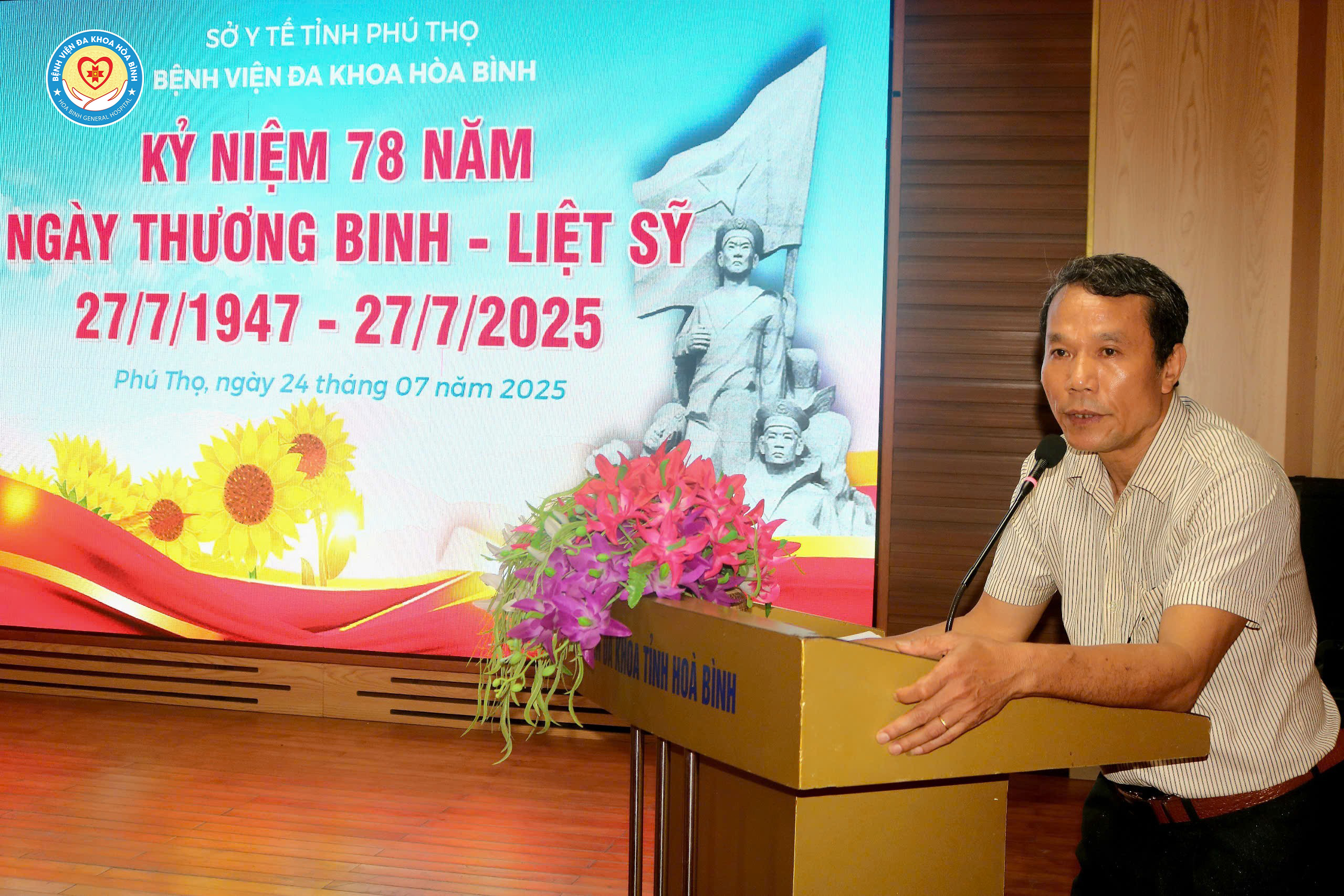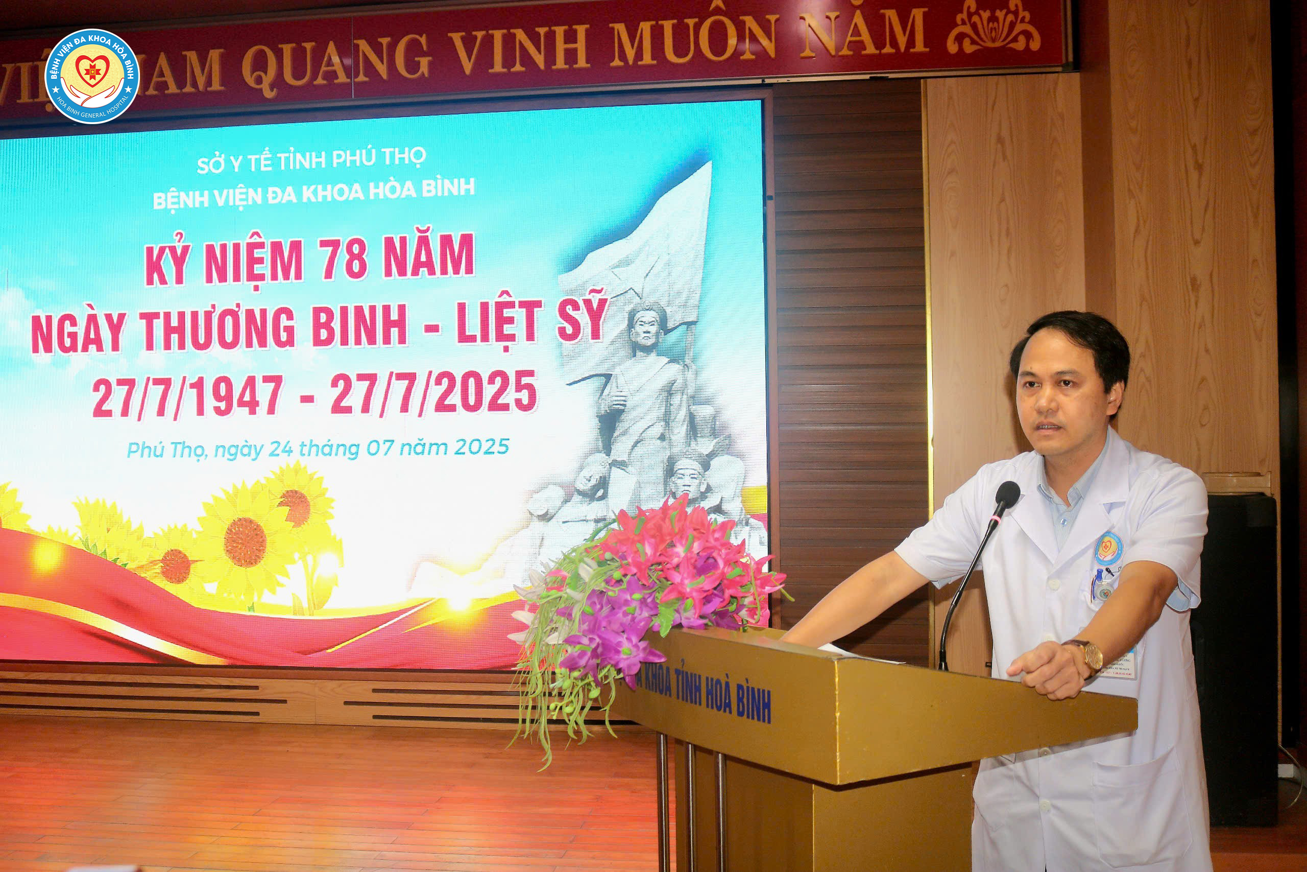 Sáng 25/7, trong không khí cả nước hướng về Ngày Thương binh - Liệt sĩ 27/7, Bệnh viện Đa khoa Hòa Bình tổ chức Lễ kỷ niệm 78 năm Ngày Thương binh - Liệt sĩ với lòng biết ơn sâu sắc và tinh thần "Uống nước nhớ nguồn". BS.CKII Trần Hoàng Dương, Phó Giám đốc Bệnh viện dự và chủ trì chương trình.