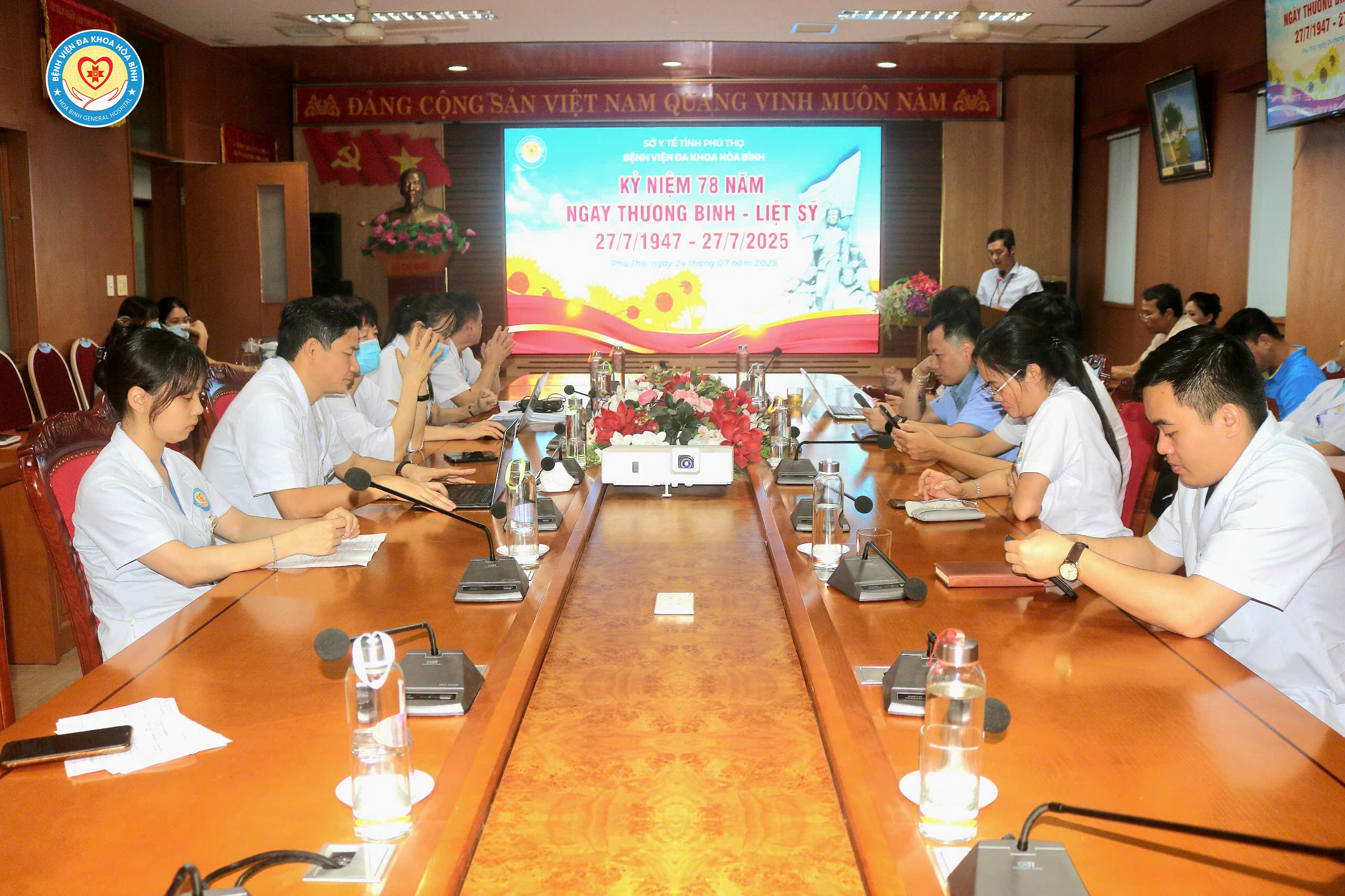Phát biểu tại chương trình, BS.CKII Trần Hoàng Dương, Phó Giám đốc Bệnh viện cho biết, hiện tại, Bệnh viện có đội ngũ nhân lực chất lượng cao làm chủ nhiều chuyên môn kỹ thuật cao, hiện đại. Bệnh viện đang ngày càng phát triển đáp ứng nhu cầu khám chữa bệnh và chăm sóc sức khoẻ của nhân dân. Để có được những thành quả này không đơn thuần là những nỗ lực cống hiến của tập thể cán bộ, viên chức và người lao động bệnh viện. Kết quả đó còn là sự kết tinh của sức mạnh ông cha, những thế hệ đi trước, những người đã không quản ngại hy sinh bản thân, xương máu đổi lấy độc lập, tự do, hạnh phúc của nhân dân. Ngày Thương binh liệt sĩ 27/7 là dịp để mỗi cán bộ, nhân viên y tế Bệnh viện Đa khoa Hoà Bình nhìn lại lịch sử hào hùng của dân tộc, ôn lại truyền thống đấu tranh bất khuất, kiên cường của các anh hùng liệt sĩ. Đồng thời, là dịp để thể hiện lòng biết ơn vô hạn đối với những người đã hy sinh xương máu vì độc lập, tự do của Tổ quốc.