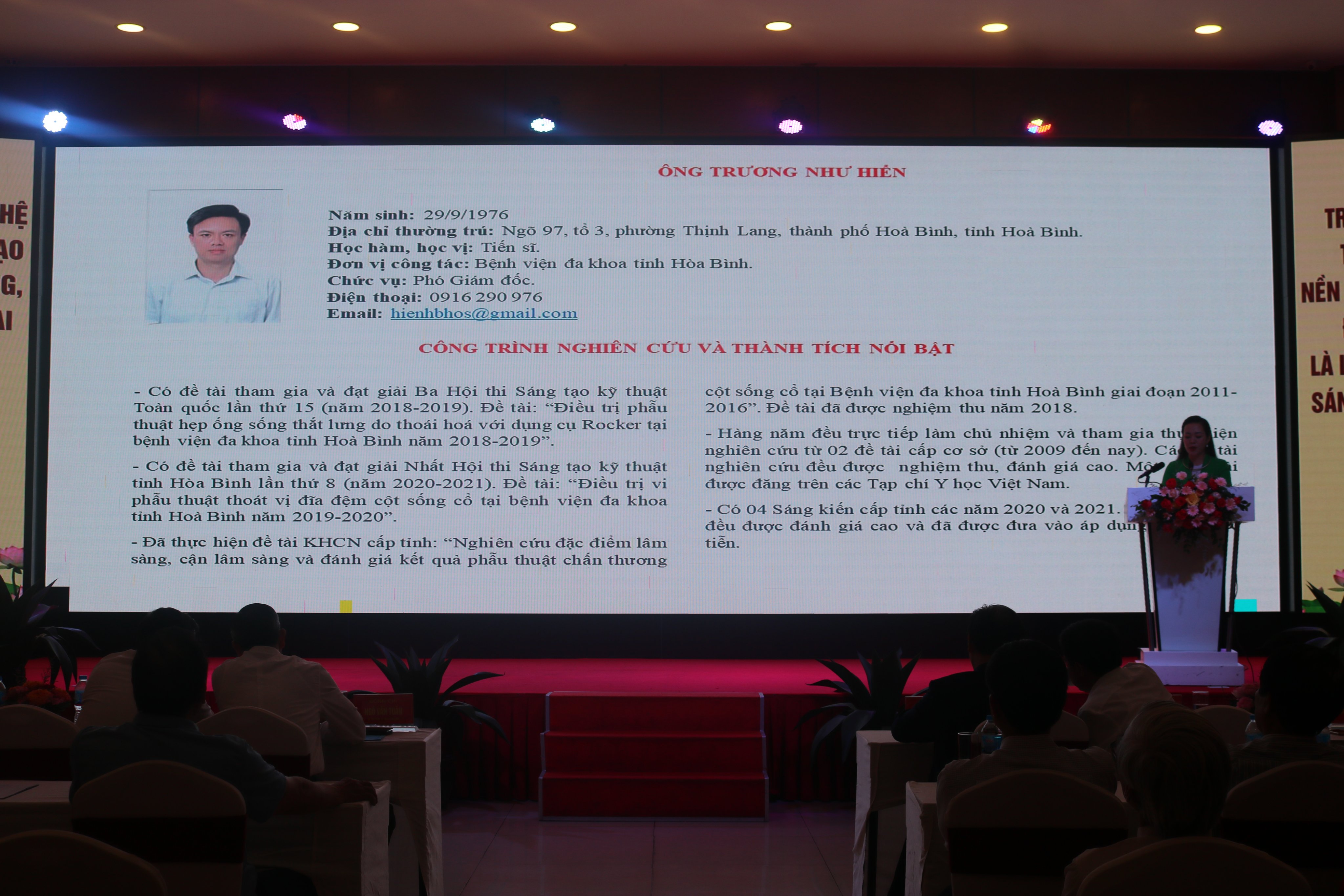 Ngày 13/5, UBND tỉnh Hoà Bình long trọng tổ chức Lễ tôn vinh trí thức khoa học công nghệ tiêu biểu tỉnh Hoà Bình lần thứ I, năm 2022. Đồng chí Ngô Văn Tuấn, Ủy viên BCH TƯ Đảng, Bí thư tỉnh ủy, Trưởng đoàn Đại biểu Quốc hội tỉnh Hoà Bình dự và chủ trì buổi lễ. Tham dự còn có lãnh đạo UBND tỉnh, Ban Tuyên giáo Tỉnh ủy, các sở, ngành, cơ quan, đoàn thể, lãnh đạo các Hội, ban ngành trong tỉnh và 20 đại biểu là các trí thức khoa học công nghệ tiêu biểu tỉnh Hoà Bình năm 2022. Đồng chí Phan Xuân Dũng, Bí thư Đảng đoàn, Chủ tịch Hội liên hiếp các Hội KH&KT Việt Nam dự và phát biểu chúc mừng. Bệnh viện Đa khoa tỉnh Hoà Bình vinh dự có 02 trí thức được tham dự và tôn vinh gồm: TS.BS Nguyễn Hoàng Diệu, Giám đốc Bệnh viện và TS.BS Trương Như Hiển, Phó Giám đốc Bệnh viện.