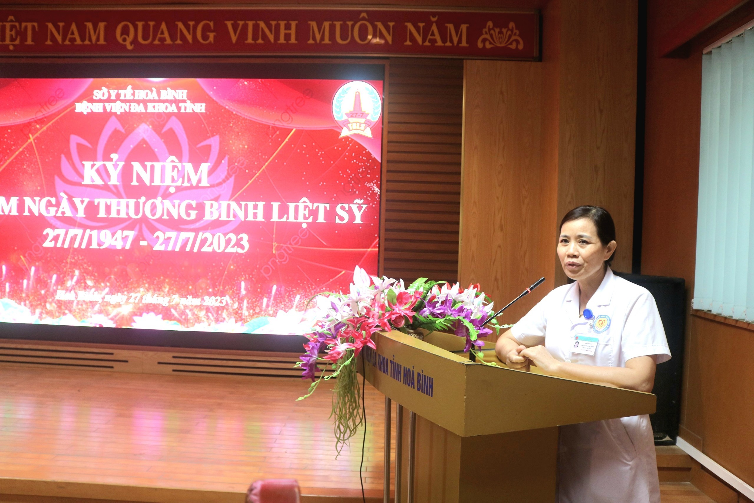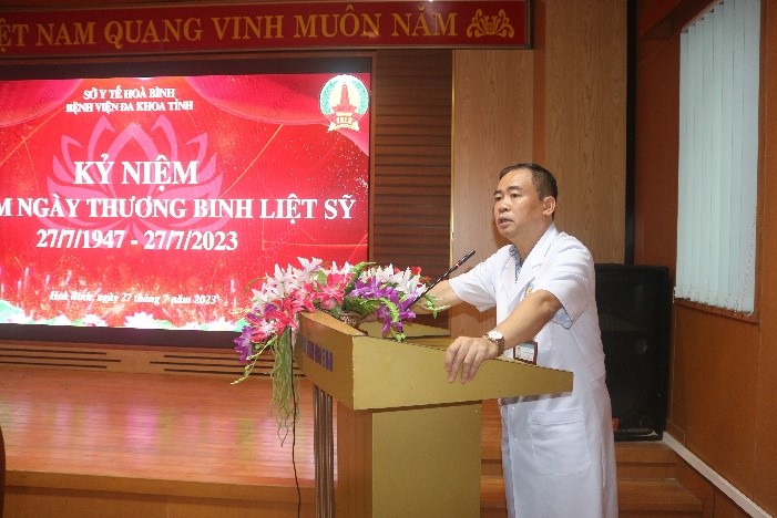 Sáng 27/7, Bệnh viện Đa khoa tỉnh Hoà Bình tổ chức chương trình kỷ niệm 76 năm Ngày thương binh liệt sỹ 27/7/1947 – 27/7/2023. TS.BS Nguyễn Hoàng Diệu, Bí thư Đảng uỷ, Giám đốc Bệnh viện dự và động viên chương trình.