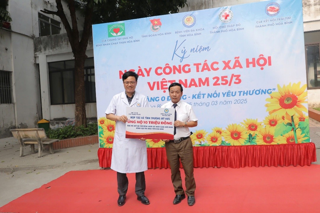 Nhân dịp này, Hợp tác xã tình thương Mỹ Đức đã trao 10 triệu đồng cho Quỹ hỗ trợ bệnh nhân có hoàn cảnh khó khăn tại BVĐK tỉnh. Đồng thời, BVĐK tỉnh cũng tổ chức lễ tri ân các đơn vị từ thiện đã đồng hành cùng bệnh viện trong công tác hỗ trợ người bệnh, bao gồm: Tỉnh Đoàn Hòa Bình, Hội Chữ thập đỏ TP Hòa Bình, Hợp tác xã tình thương Mỹ Đức, CLB Kết nối trái tim TP Hòa Bình, CLB Áo xanh TP Hòa Bình, CLB Chung tay ủng hộ bệnh nhân chạy thận Hòa Bình, CLB Cắt tóc thiện nguyện TP Hòa Bình…