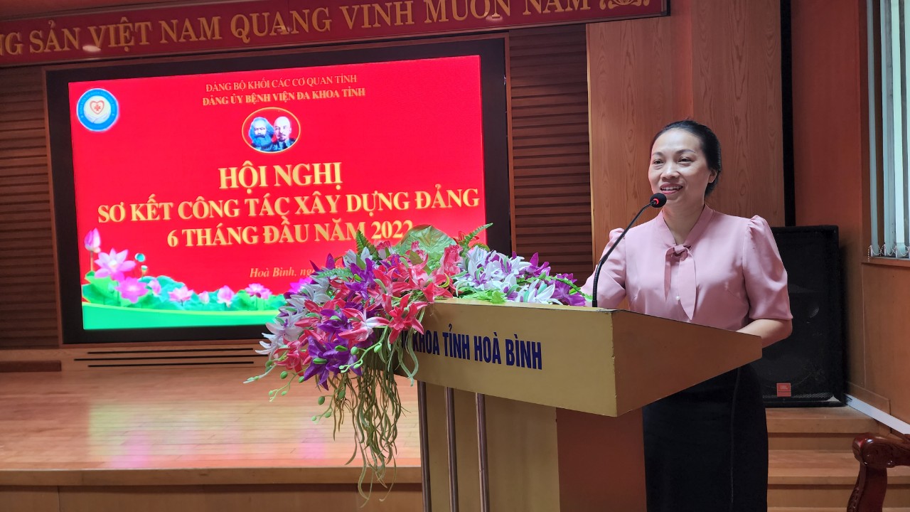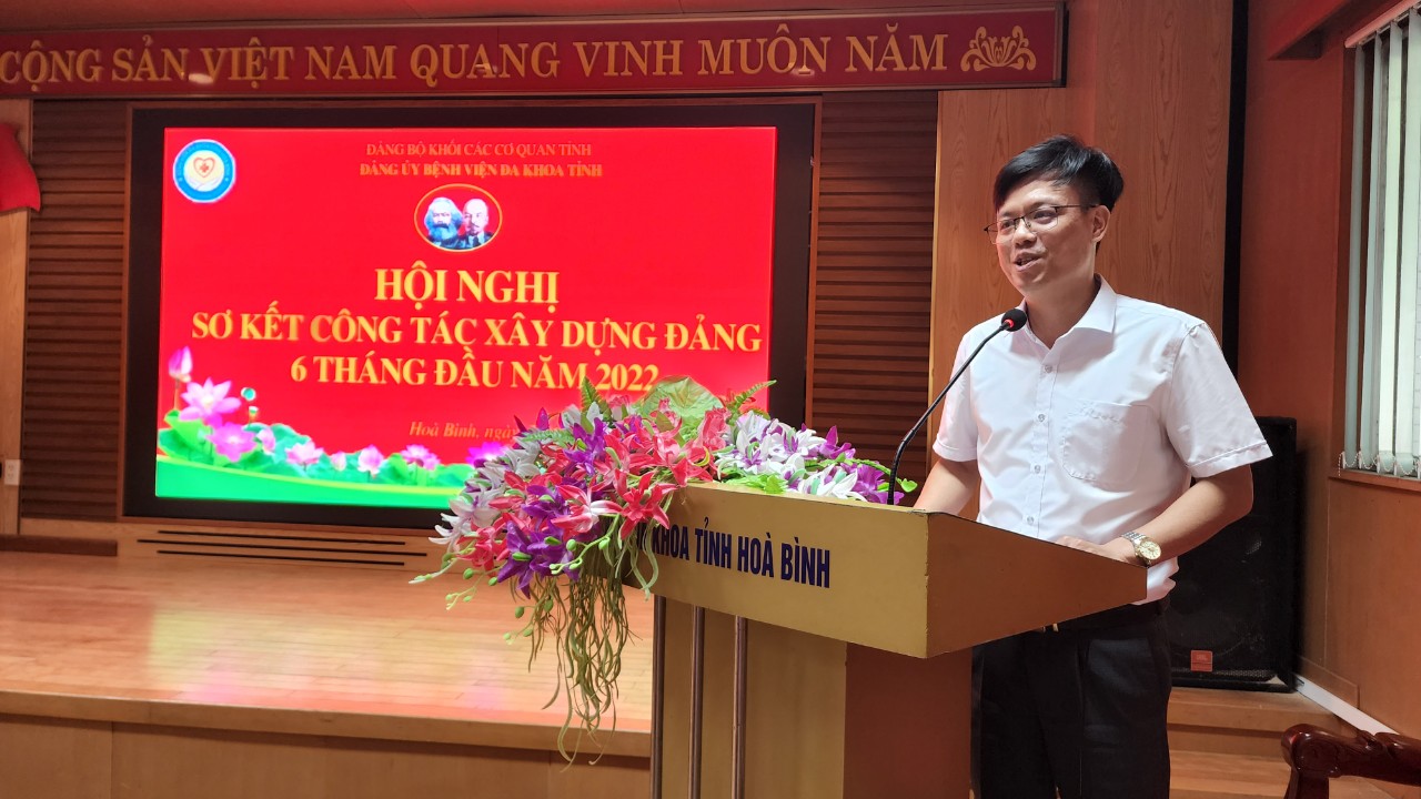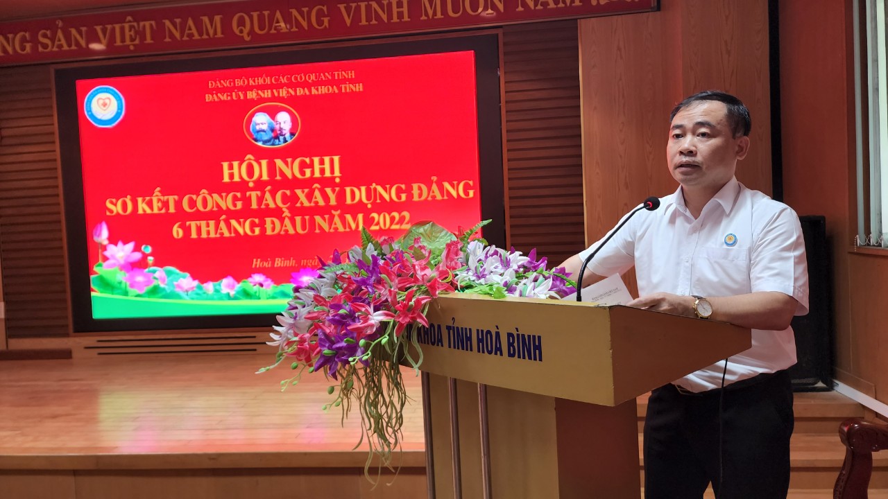 Ngày 28/7, Ban chấp hành Đảng bộ Bệnh viện Đa khoa tỉnh Hòa Bình tổ chức Hội nghị sơ kết công tác xây dựng Đảng 6 tháng đầu năm 2022. Tham dự hội nghị có đồng chí Bùi Thị Thanh- Ủy viên Ban chấp hành Đảng bộ Khối các cơ quan tỉnh, Phó chủ nhiệm Ủy ban kiểm tra Đảng ủy Khối, các đồng chí Uỷ viên Ban chấp hành Đảng bộ, Uỷ viên UBKT Đảng uỷ Bệnh viện, các đồng chí Bí thư, Phó Bí thư, cấp uỷ viên của 15 chi bộ trực thuộc Đảng bộ Bệnh viện. Đồng chí Nguyễn Hoàng Diệu - Ủy viên Ban chấp hành Đảng bộ Khối, Bí thư Đảng ủy, Giám đốc Bệnh viện chủ trì hội nghị.