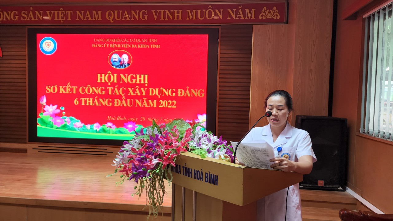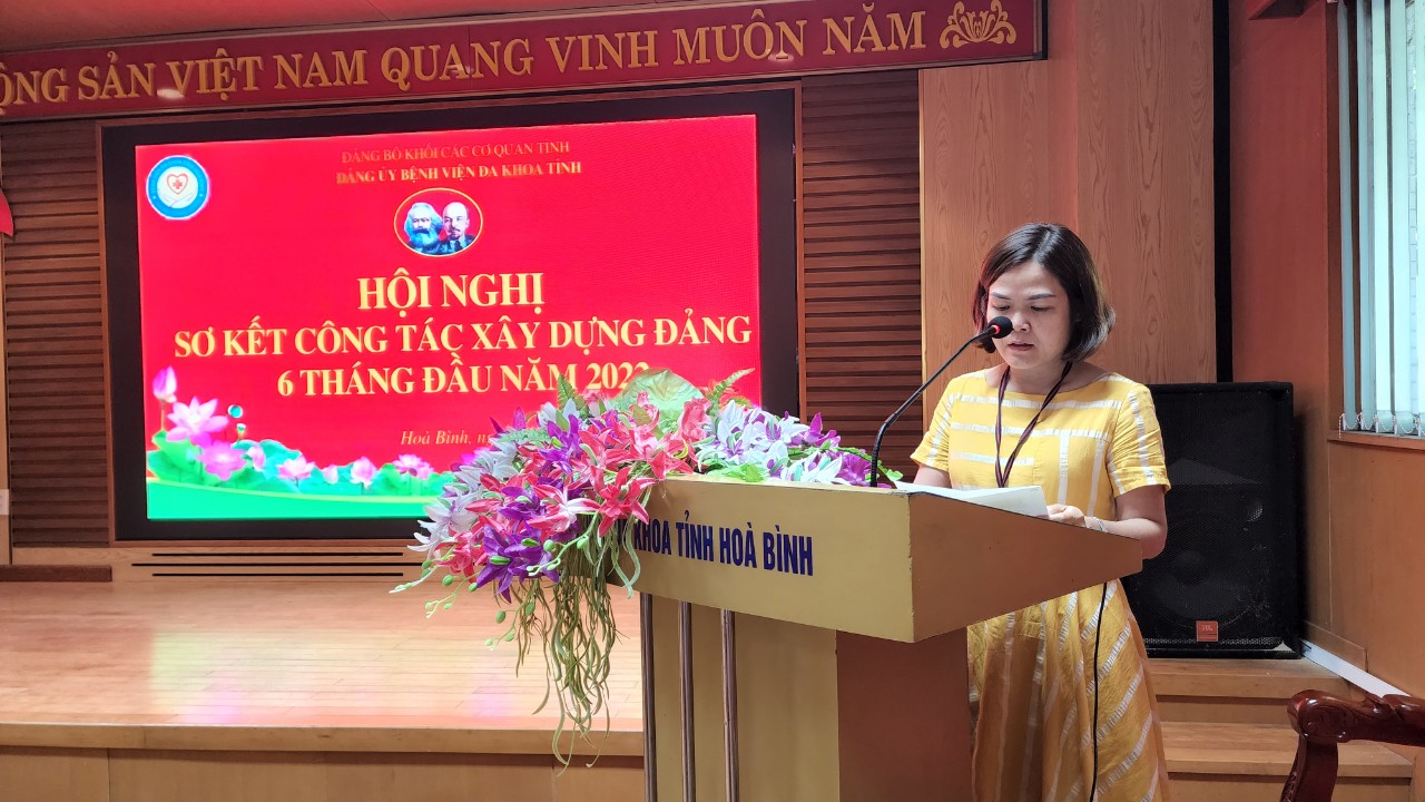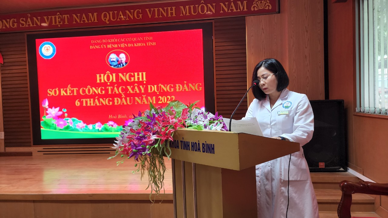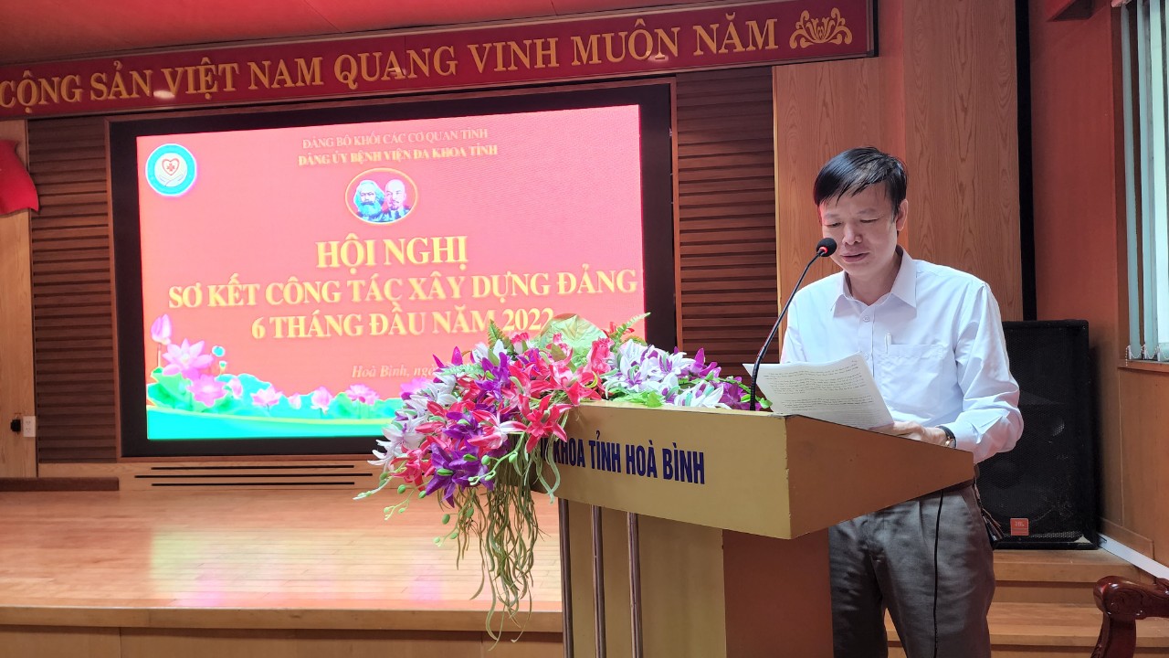 Ngày 28/7, Ban chấp hành Đảng bộ Bệnh viện Đa khoa tỉnh Hòa Bình tổ chức Hội nghị sơ kết công tác xây dựng Đảng 6 tháng đầu năm 2022. Tham dự hội nghị có đồng chí Bùi Thị Thanh- Ủy viên Ban chấp hành Đảng bộ Khối các cơ quan tỉnh, Phó chủ nhiệm Ủy ban kiểm tra Đảng ủy Khối, các đồng chí Uỷ viên Ban chấp hành Đảng bộ, Uỷ viên UBKT Đảng uỷ Bệnh viện, các đồng chí Bí thư, Phó Bí thư, cấp uỷ viên của 15 chi bộ trực thuộc Đảng bộ Bệnh viện. Đồng chí Nguyễn Hoàng Diệu - Ủy viên Ban chấp hành Đảng bộ Khối, Bí thư Đảng ủy, Giám đốc Bệnh viện chủ trì hội nghị.