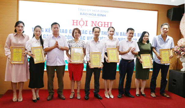 Đồng chí Tuyết (thứ 2 từ trái sang) nhận giải thưởng tại Hội nghị tổng kết giải ảnh Báo chí “Nét đẹp Hoà Bình” lần thứ I năm 2022 do Báo Hoà Bình tổ chức
