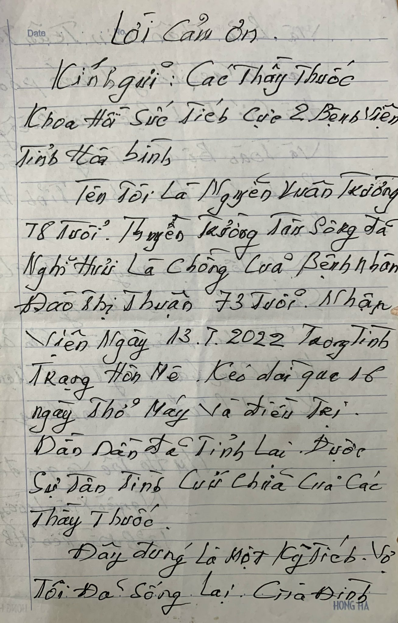 Thư cảm ơn của người bệnh gửi khoa Hồi sức tích cực 2