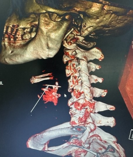 Tại bệnh viện, các bác sĩ tiến hành thăm khám và chẩn đoán: Viêm tấy, phù nề hạ họng phải do hóc dị vật nghi ngờ là xương cá. Khi nội soi vùng họng, không phát hiện được dị vật. Nhận định đây là trường hợp hóc dị vật phức tạp, nghi ngờ dị vật mắc sâu trong vùng đáy xoang lê bên phải hoặc dưới miệng thực quản, các bác sĩ chỉ định chụp Cắt lớp vi tính (CLVT) 64 dãy có dựng hình 3D. Kết quả cho thấy hình ảnh dị vật nằm ở xoang lê bên phải, cạnh thành khí quản, ngang mức đốt sống C4.