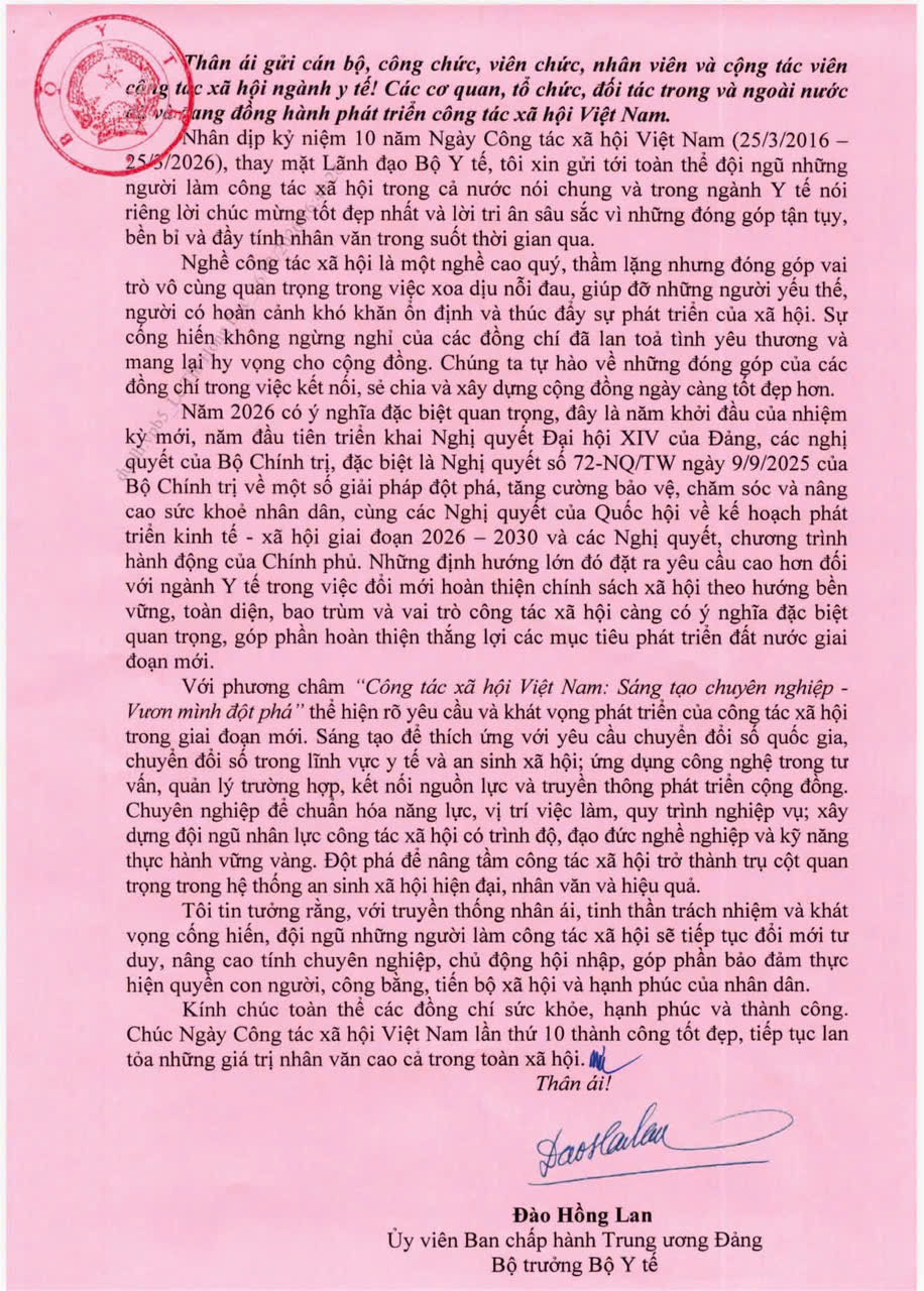 Nhân dịp này, Bộ trưởng Bộ Y tế Đào Thị Hồng Lan đã gửi thư chúc mừng tới toàn thể cán bộ, công chức, viên chức và nhân viên công tác xã hội trên cả nước. Trong thư, Bộ trưởng ghi nhận và biểu dương những nỗ lực, cống hiến thầm lặng của đội ngũ làm công tác xã hội; đồng thời bày tỏ mong muốn lực lượng này sẽ tiếp tục phát huy tinh thần trách nhiệm, đổi mới, sáng tạo, góp phần nâng cao chất lượng chăm sóc sức khỏe nhân dân và lan tỏa sâu rộng các giá trị nhân văn trong xã hội.