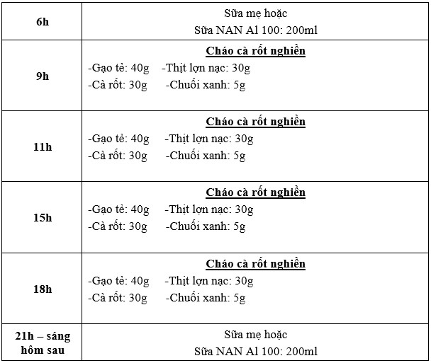 Ngày ăn 6 bữa: 02 Sữa + 4 cháo cà rốt nghiền