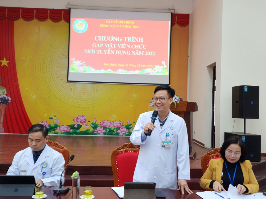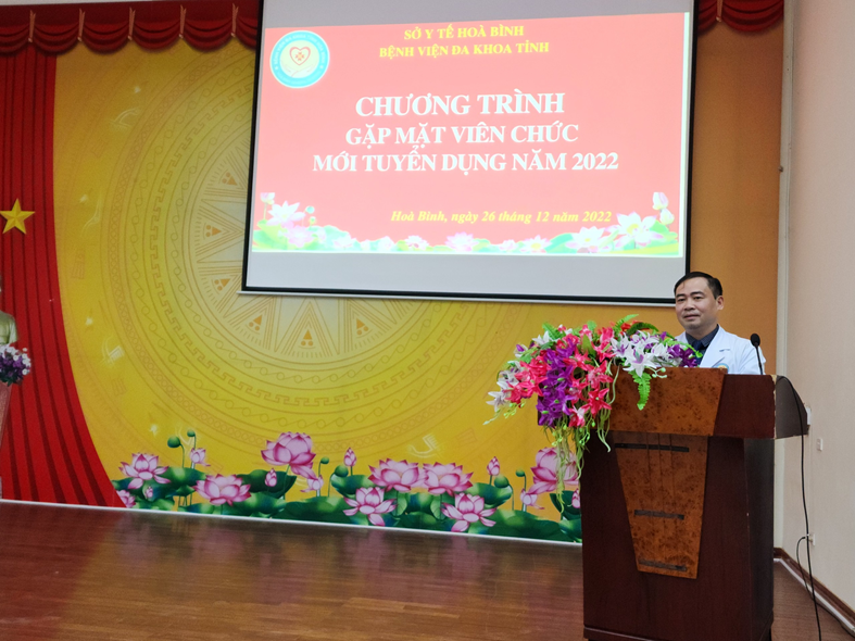 Tại chương trình gặp mặt, Thầy thuốc ưu tú, TS.BS Nguyễn Hoàng Diệu, Giám đốc Bệnh viện nhiệt liệt chào mừng các viên chức mới về ngôi nhà chung Bệnh viện Đa khoa tỉnh Hoà Bình. Đồng chí Giám đốc Bệnh viện cho biết, Bệnh viện Đa khoa tỉnh là Bệnh viện hạng I trực thuộc sở Y tế, là đơn vị y tế tuyến cuối của tỉnh với nhiều khoa phòng có lĩnh vực hoạt động chuyên môn sâu. Bệnh viện đang trên đà phát triển và trong tương lai sẽ còn phát triển hơn nữa. Vì vậy, công tác tuyển dụng nhân sự cũng như đào tạo nâng cao trình độ cho cán bộ rất được bệnh viện quan tâm chú trọng. Việc tuyển dụng các viên chức mới năm 2022 là cơ hội không chỉ cho các viên chức mới, mà còn là cơ hội để Bệnh viện Đa khoa tỉnh ngày càng phát triển lớn mạnh hơn, với đội ngũ nhân sự hùng hậu hơn. Tuy nhiên, đồng chí Giám đốc Bệnh viện cũng không quên nhắc nhở các viên chức mới về những khó khăn, vất vả mà các viên chức mới sẽ cần phải bản lĩnh, vừng vàng và kiên định để vượt qua. Đồng thời, xác định tư tưởng, xây dựng kế hoạch, lộ trình phát triển của cá nhân gắn liền với sự phát triển của khoa, phòng nơi mình công tác và cả với sự phát triển của Bệnh viện. Cuối cùng, đồng chí Giám đốc cũng gửi lời động viên tới các viên chức mới, trong sự nghiệp của các viên chức mới luôn có sự đồng hành, hỗ trợ, giúp đỡ từ Ban Giám đốc, các khoa phòng và các đồng nghiệp.