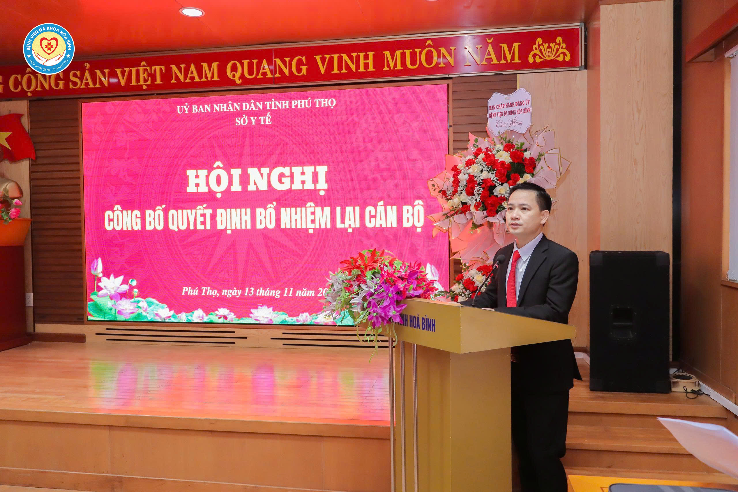 Tại Hội nghị, lãnh đạo phòng Tổ chức cán bộ Sở Y tế Phú Thọ thừa uỷ quyền Chủ tịch UBND tỉnh Phú Thọ đã công bố Quyết định số 1686/QĐ-UBND ngày 8/11/2025 về việc bổ nhiệm lại TS.BS Nguyễn Hoàng Diệu, Giám đốc Bệnh viện Đa khoa Hoà Bình. Theo Quyết định, TS.BS Nguyễn Hoàng Diệu được bổ nhiệm lại giữ chức Giám đốc Bệnh viện Đa khoa Hoà Bình trực thuộc Sở Y tế Phú Thọ trong thời hạn 5 năm kể từ ngày 02/11/2025.