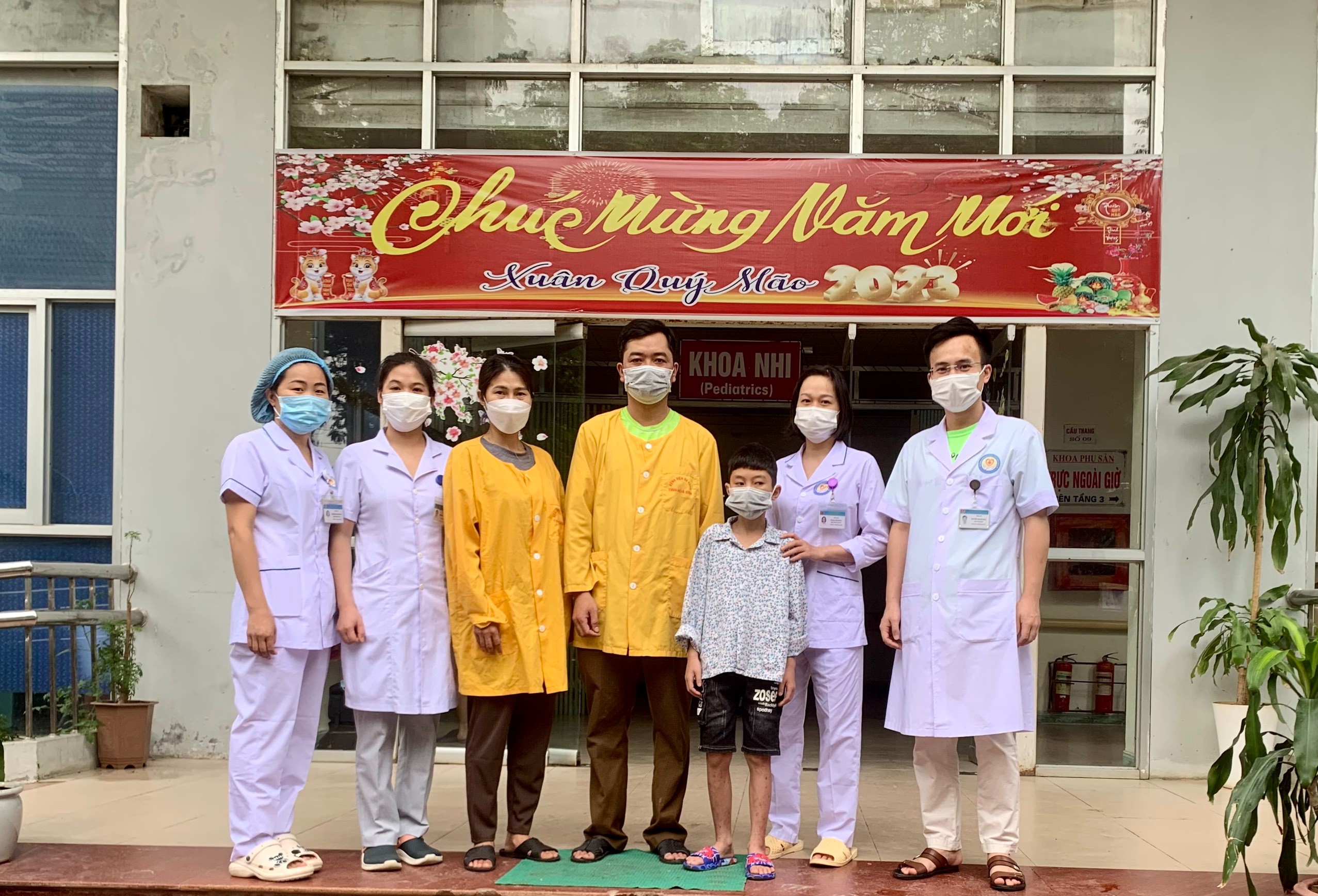 Cán bộ y tế khoa Nhi chụp ảnh lưu niệm với bệnh nhi và gia đình
