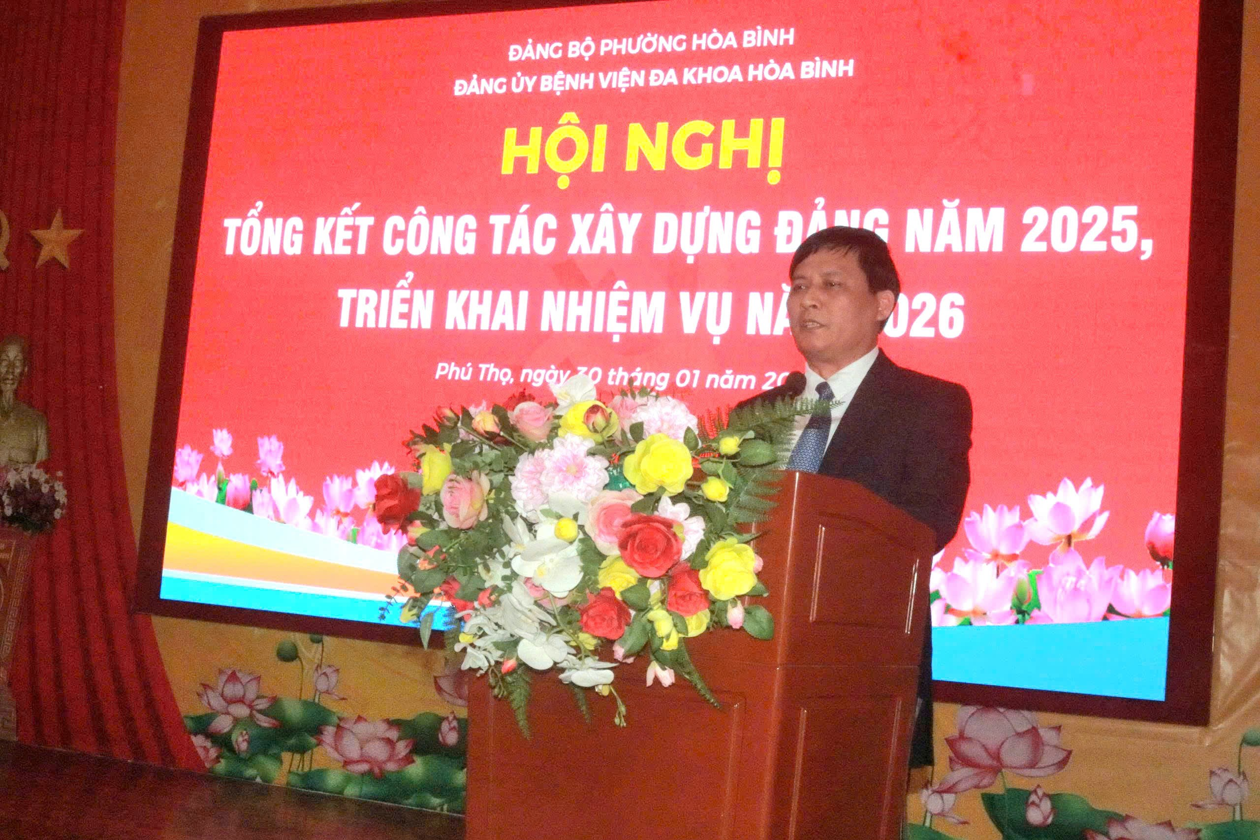 Chiều 30/01, Đảng bộ Bệnh viện Đa khoa Hòa Bình long trọng tổ chức Hội nghị Tổng kết công tác xây dựng Đảng năm 2025, triển khai nhiệm vụ năm 2026. Dự và chỉ đạo Hội nghị có đồng chí Nguyễn Hữu Luyện, Phó Bí thư Đảng ủy, Chủ tịch UBND phường Hòa Bình. Tham dự còn có Nguyễn Thị Sang, Ủy viên BCH Đảng bộ, Phó Trưởng Ban xây dựng Đảng, Đảng ủy phường Hòa Bình; TS.BS Nguyễn Hoàng Diệu, Bí Thư Đảng ủy, Giám đốc Bệnh viện, các đồng chí trong Ban chấp hành Đảng ủy, lãnh đạo các chi bộ Đảng và Đảng viên đại diện cho 300 Đảng viên trong toàn Đảng bộ.