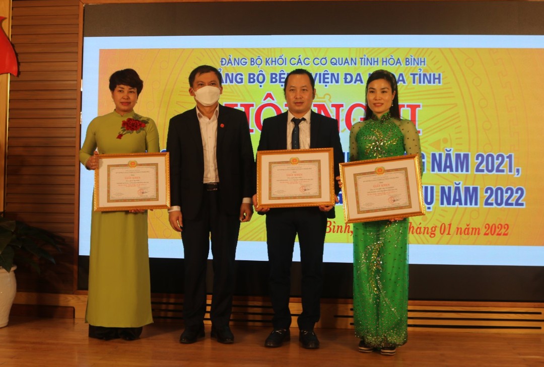 Nhân dịp này, Đồng chí Bí thư Đảng bộ Bệnh viện đã tặng Giấy khen cho 02 tập thể đạt danh hiệu hoàn thành xuất sắc nhiệm vụ năm 2021 gồm Chi bộ khối Liên khoa và Chi bộ khối Ngoại. Biểu dương 08 chi bộ trực thuộc Đảng bộ Bệnh viện là Chi bộ tiêu biểu trong năm 2021. Đảng uỷ khối các cơ quan tỉnh tặng Giấy khen cho 4 cá nhân của Bệnh viện đạt tiêu chuẩn Hoàn thành xuất sắc nhiệm vụ 5 năm liên tục từ 2017- 2021.
