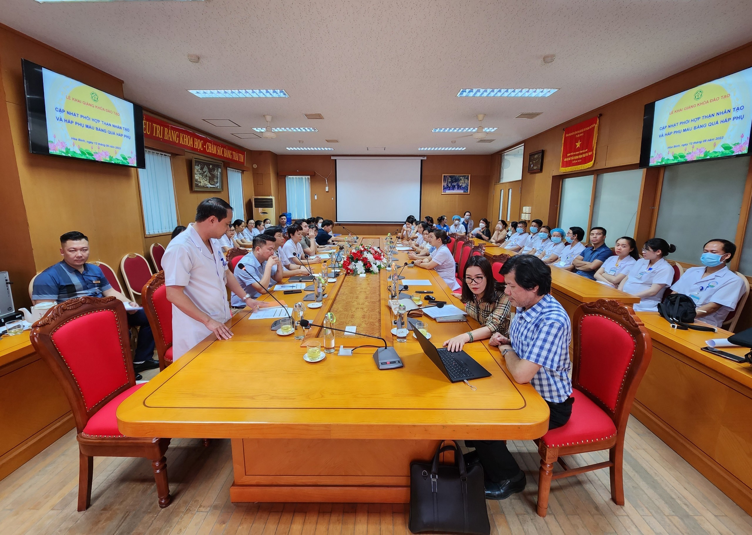 Ngày 12/9, Bệnh viện Đa khoa tỉnh Hoà Bình phối hợp với Bệnh viện Bạch Mai tổ chức khoa Đào tạo cập nhật phối hợp thận nhân tạo và hấp phụ máu bằng quả hấp phụ. Tham dự có BS.CKII Trần Hoàng Dương, Phó Giám đốc Bệnh viện Đa khoa tỉnh cùng hơn 50 học viên đến từ Bệnh viện Đa khoa tỉnh và Trung tâm y tế các huyện, thành phố. Báo cáo viên tại chương trình có TS.BS Nguyễn Hữu Dũng, Phó Giám đốc Trung tâm Thận tiết niệu - Lọc máu, Bệnh viện Bạch Mai cùng các cộng sự.