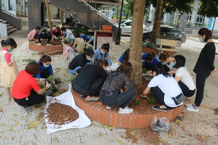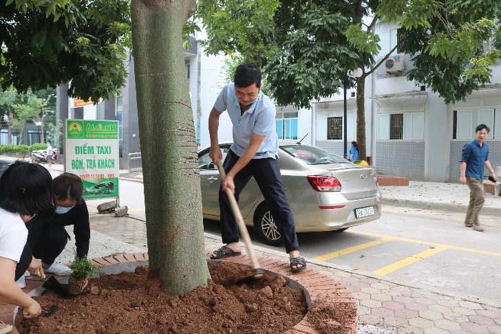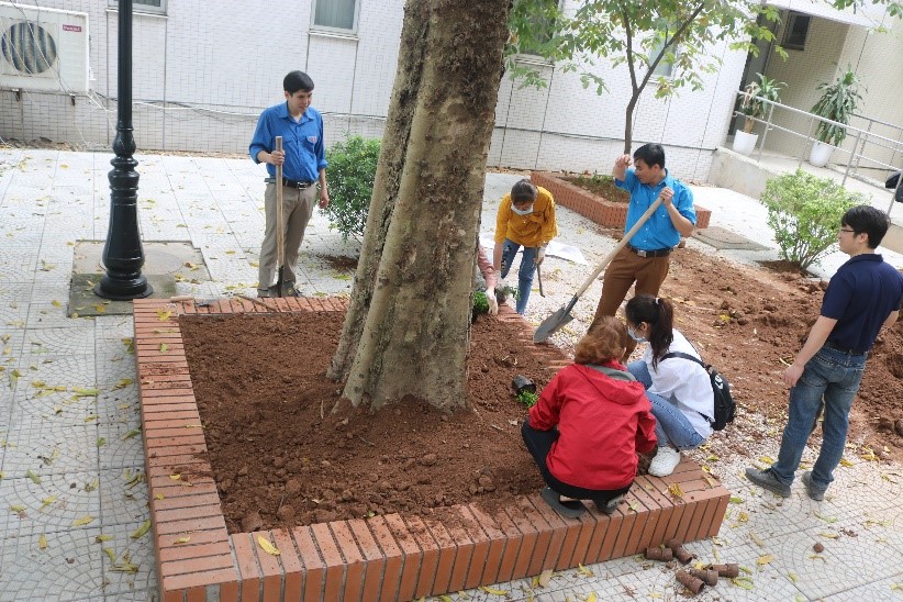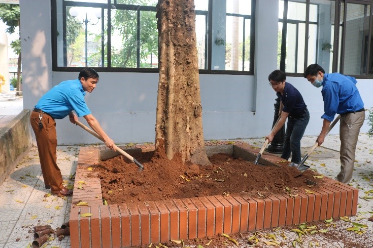 Các gốc cây to trong bệnh viện được tạo bồn, đổ đất để trang trí thêm cây con dưới tán.