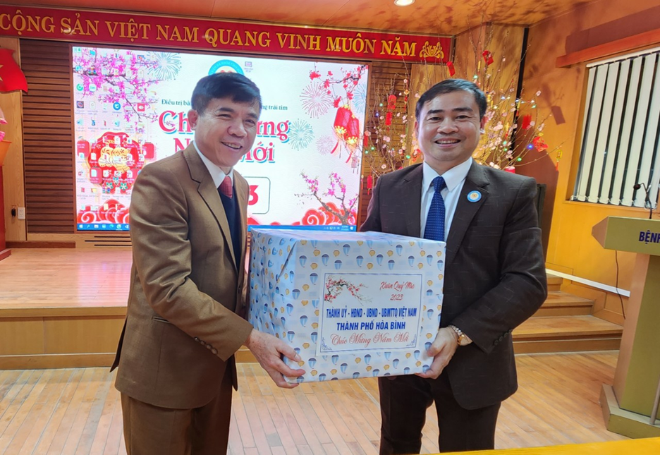 Tối ngày 21/01 (tức 30 tết), đoàn công tác của Thành ủy – HĐND – UBND - UB MTTQ VN thành phố Hòa Bình do đồng chí Bùi Quang Điệp, Tỉnh ủy viên, Phó Bí thư Thành ủy, Chủ tịch UBND thành phố Hòa Bình đã đến thăm, động viên và chúc tết cán bộ trực tết Bệnh viện Đa khoa tinh. Đón đoàn có TS.BS Nguyễn Hoàng Diệu, Giám đốc Bệnh viện, các đồng chí trong Ban Giám đốc và đại diện lãnh đạo các khoa, phòng.