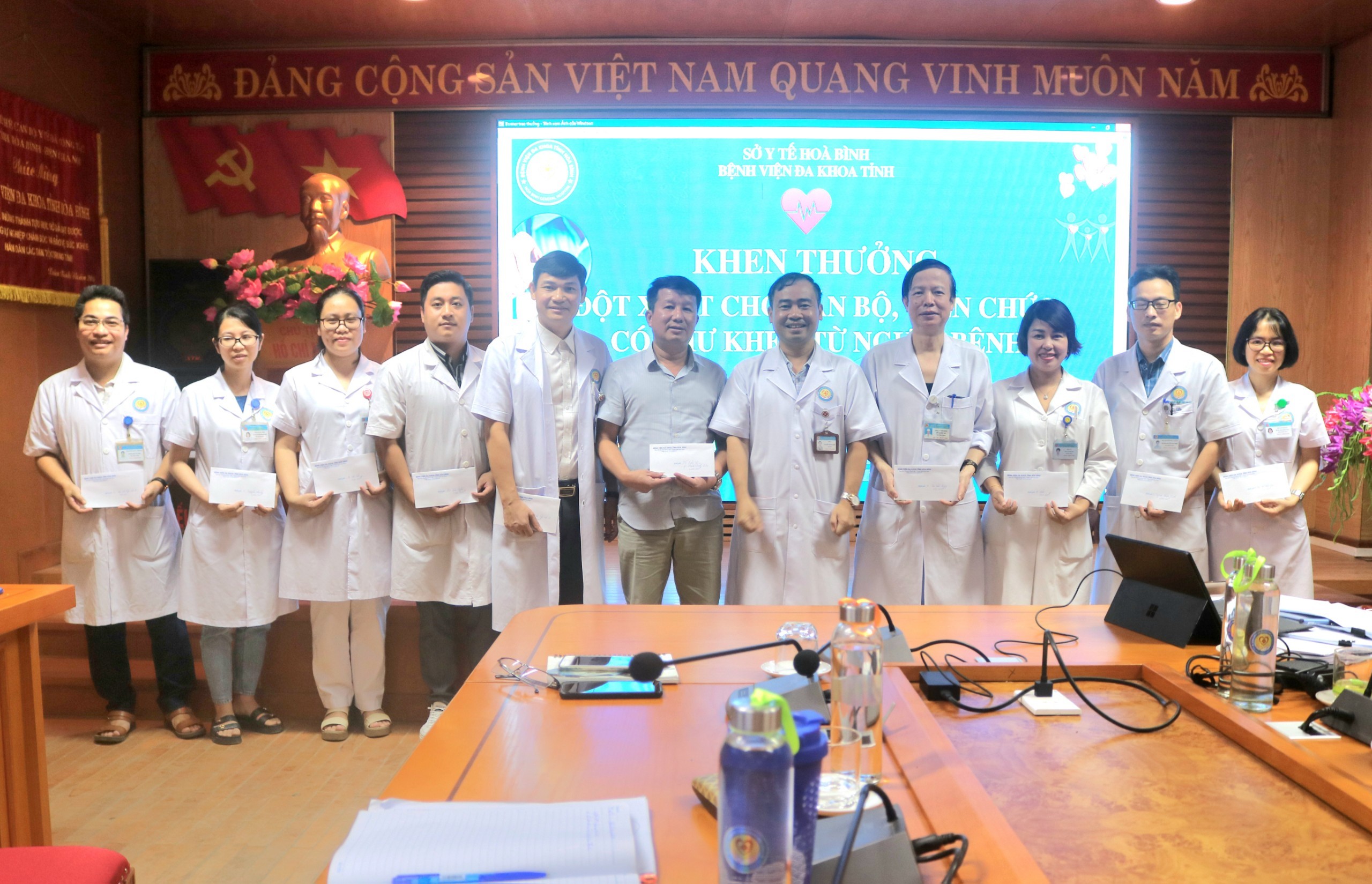 Tại Hội nghị, Ban thường trực Hội đồng thi đua khen thưởng Bệnh viện cũng công bố các quyết định khen thưởng cho các cá nhân và tập thể có thành tích xuất sắc trong công tác chuyên môn và các hoạt động phong trào của Bệnh viện. Trong đó, khen thưởng Ba triệu đồng cho đội văn nghệ Bệnh viện tham gia Hội diễn “Tiếng hát CNVC-Lao động ngành Y tế Hoà Bình năm 2023” do Công đoàn ngành Y tế Hoà Bình tổ chức. Khen thưởng một triệu đồng cho Tổ Bảo vệ Bệnh viện đã có cường độ lao động cao, tăng năng suất, hoàn thành tốt nhiệm vụ chuyên môn, phát hiện và ngăn chặn kịp thời kẻ gian trộm cắp tài sản của người bệnh và ngăn chặn hành vi biến thái với trẻ chưa đủ tuổi vị thành niên, đảm bảo an ninh trật tự trong bệnh viện.