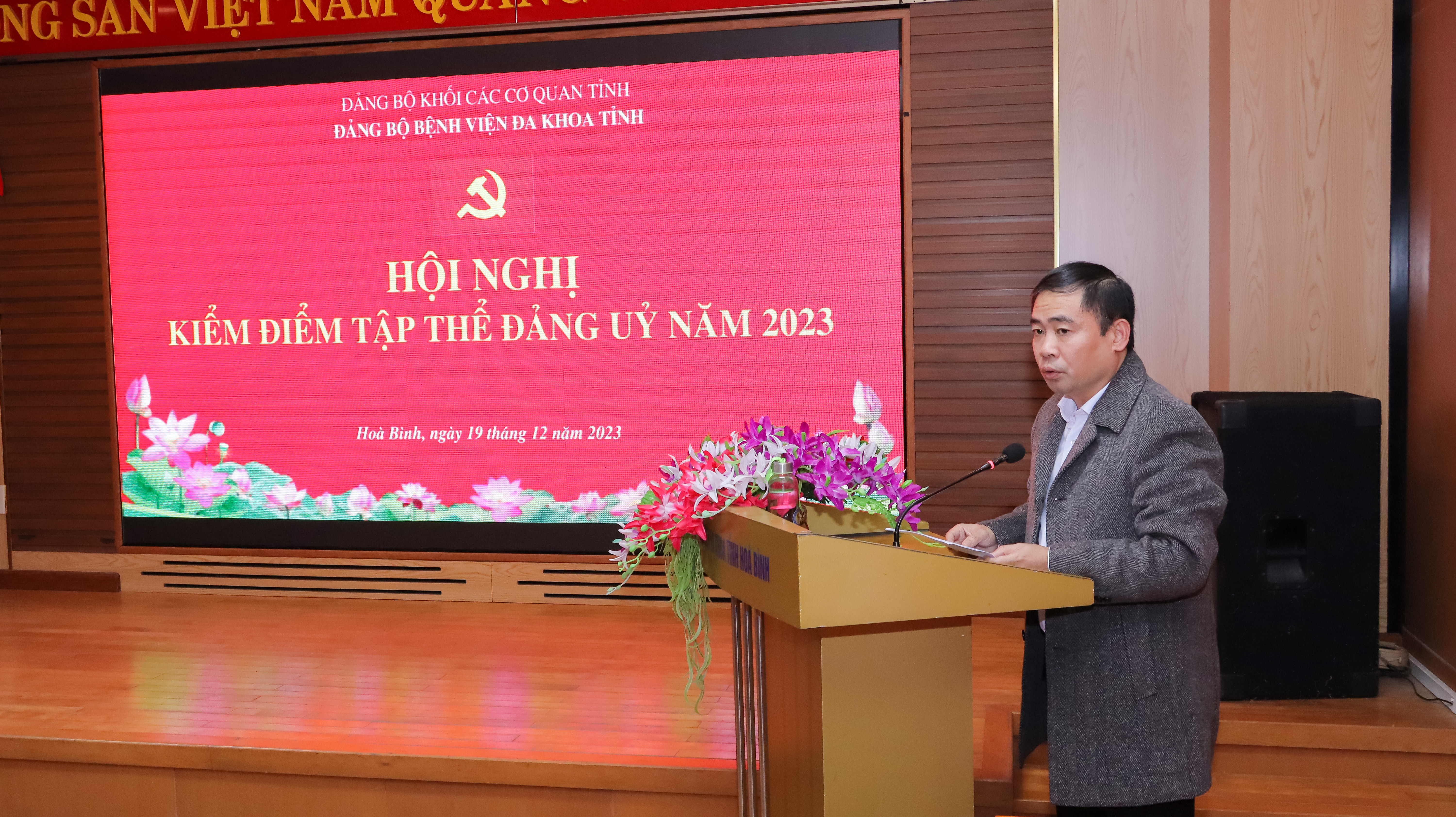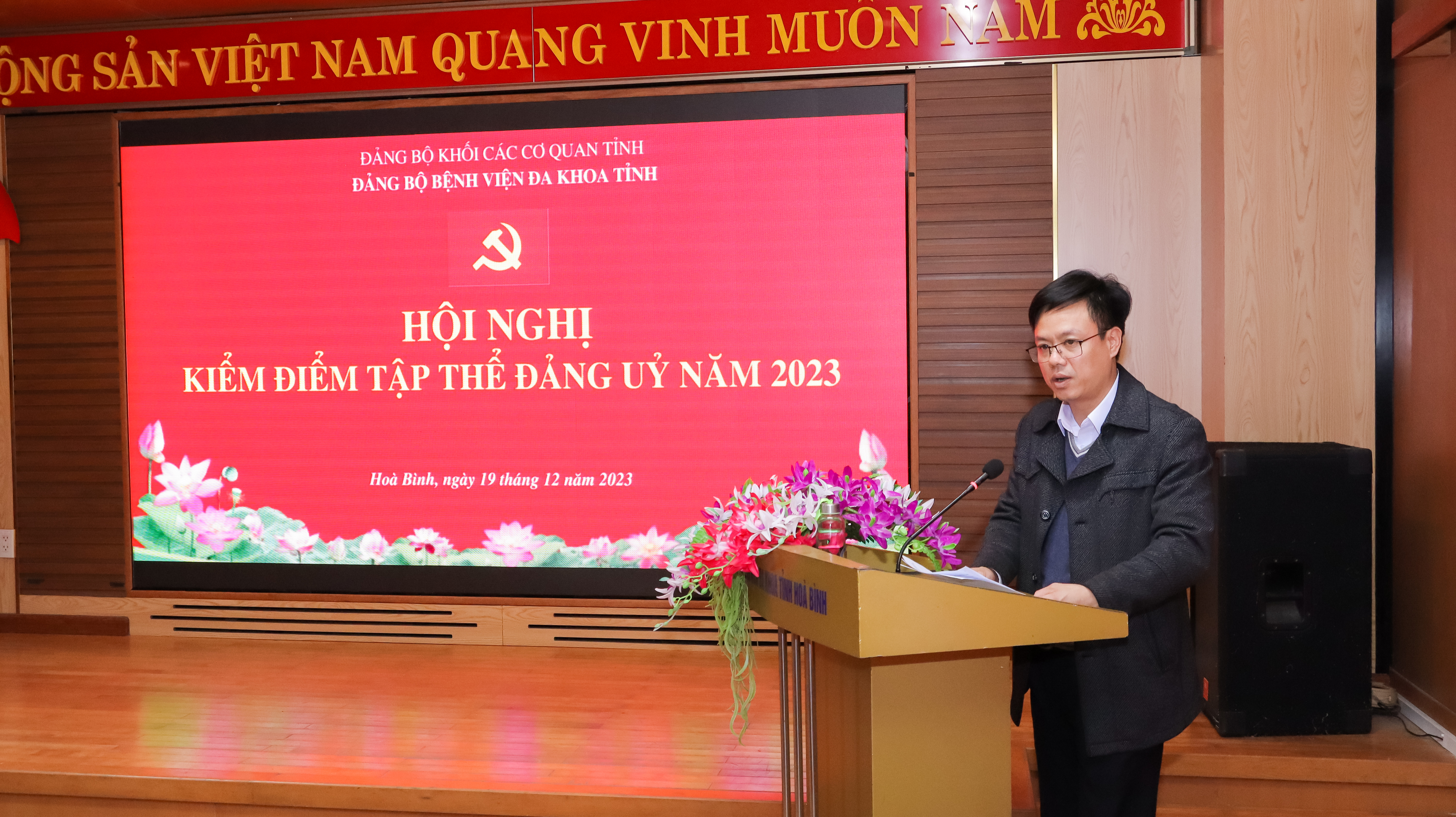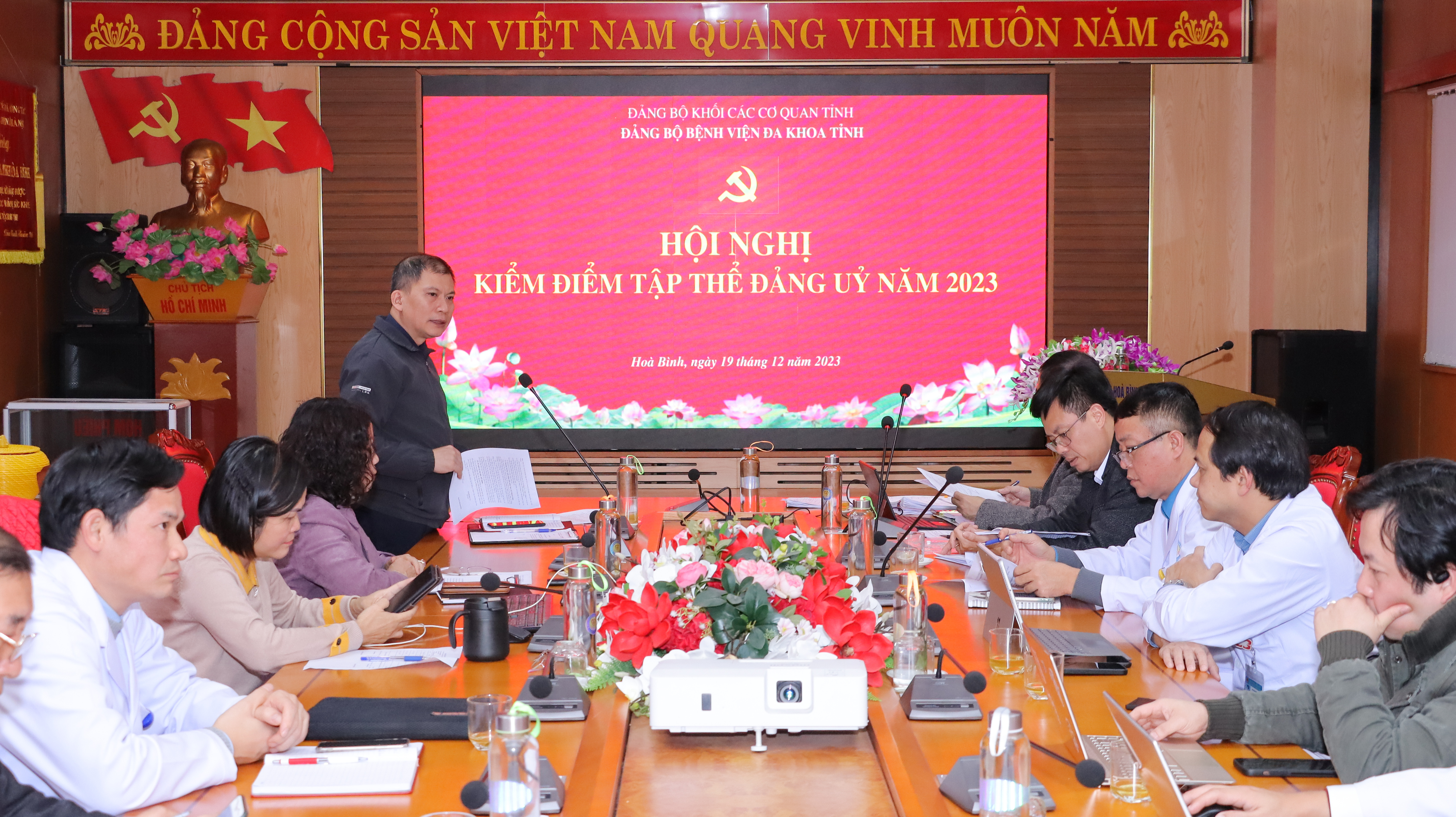 Chiều 19/12/2023, Đảng uỷ Bệnh viện Đa khoa tỉnh Hoà Bình tổ chức Hội nghị kiểm điểm tập thể Đảng uỷ Bệnh viện Đa khoa tỉnh Hoà Bình năm 2023. Tham dự có đồng chí Nguyễn Quốc Hùng, Uỷ viên BTV, Chủ nhiệm Uỷ ban kiểm tra Đảng uỷ khối các cơ quan tỉnh dự và chỉ đạo Hội nghị. TS.BS Nguyễn Hoàng Diệu - Ủy viên Ban Chấp hành Đảng bộ Khối các cơ quan tỉnh, Bí thư Đảng ủy, Giám đốc Bệnh viện chủ trì hội nghị.