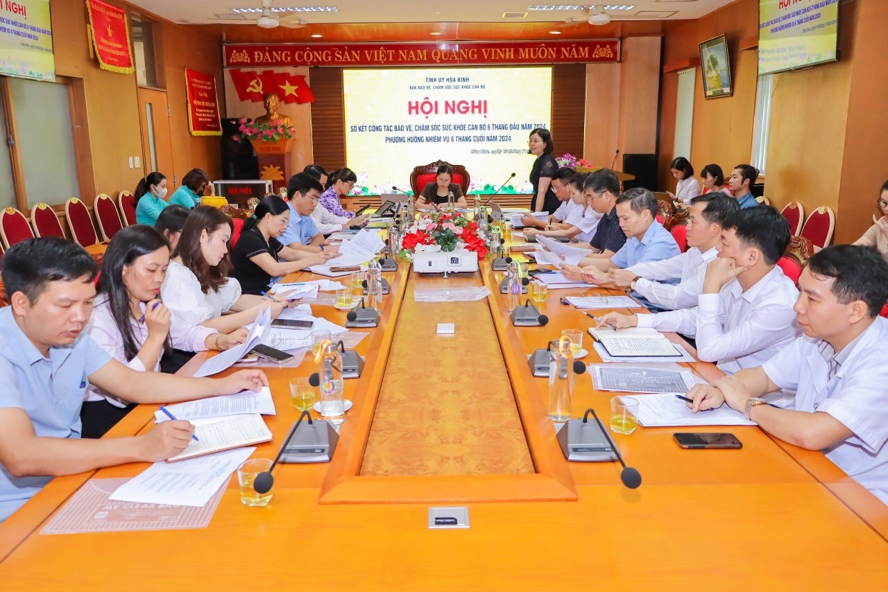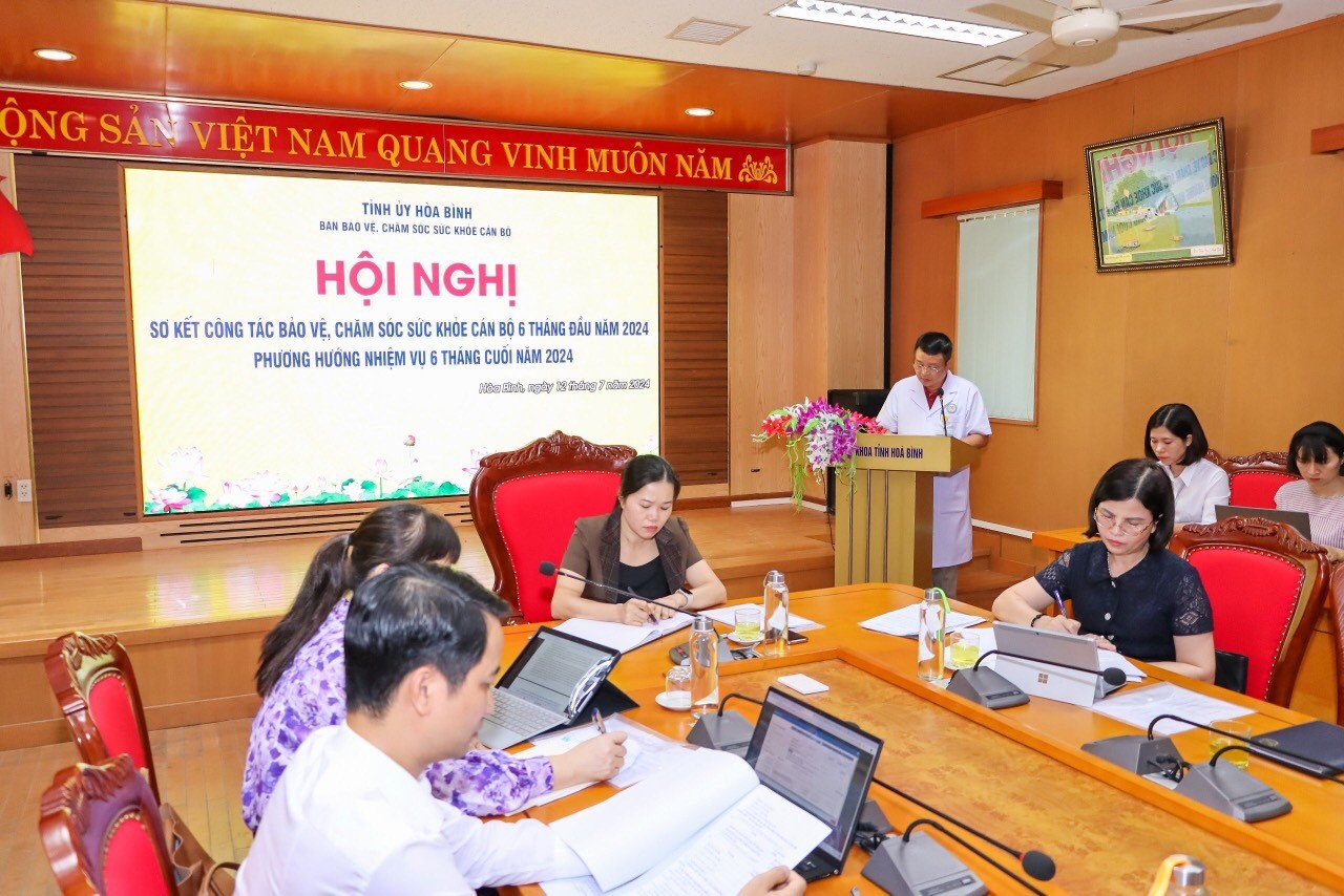 Ngày 12/7/2024, tại Bệnh viện Đa khoa tỉnh Hòa Bình, Ban Bảo vệ, chăm sóc sức khỏe cán bộ tỉnh đã tổ chức Hội nghị “Sơ kết công tác bảo vệ, chăm sóc sức khỏe cán bộ tỉnh 6 tháng đầu năm 2024 và triển khai nhiệm vụ trọng tâm 6 tháng cuối năm 2024”. Tham dự Hội nghị có các đồng chí: Bùi Thi Minh-UVTV, Trưởng Ban Tổ chức Tỉnh uỷ, Trưởng Ban bảo vệ, chăm sóc sức khoẻ cán bộ tỉnh; cùng các đồng chí lãnh đạo Ban Bảo vệ sức khỏe cán bộ tỉnh, Trưởng Ban Bảo vệ sức khỏe cán bộ các huyện, thành phố và các đ/c thành viên Hội đồng chuyên môn Ban Bảo vệ, chăm sóc sức khỏe cán bộ tỉnh; lãnh đạo các phòng chuyên môn và chuyên viên Sở Y tế tỉnh; các đồng chí cán bộ, viên chức khoa Bảo vệ sức khỏe cán bộ tỉnh, thuộc Bệnh viện Đa khoa tỉnh.