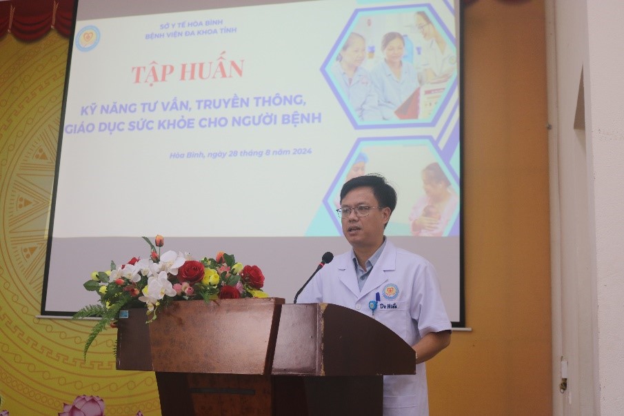 Ngày hai ngày 28 và 29/8, Bệnh viện Đa khoa tỉnh Hoà Bình tổ chức 02 lớp tập huấn cho Điều dưỡng, Hộ sinh, Kỹ thuật viên y về kỹ năng tư vấn, truyền thông, giáo dục sức khoẻ cho người bệnh. TS.BS Trương Như Hiển, Phó Giám đốc Bệnh viện dự và chỉ đạo chương trình. Tham dự còn có 230 học viên của 02 lớp tập huấn đến từ các khoa lâm sàng và cận lâm sàng trong Bệnh viện. ThS Nguyễn Thị Thanh Bình, Trưởng phòng Điều dưỡng Bệnh viện là báo cáo viên tại lớp tập huấn.