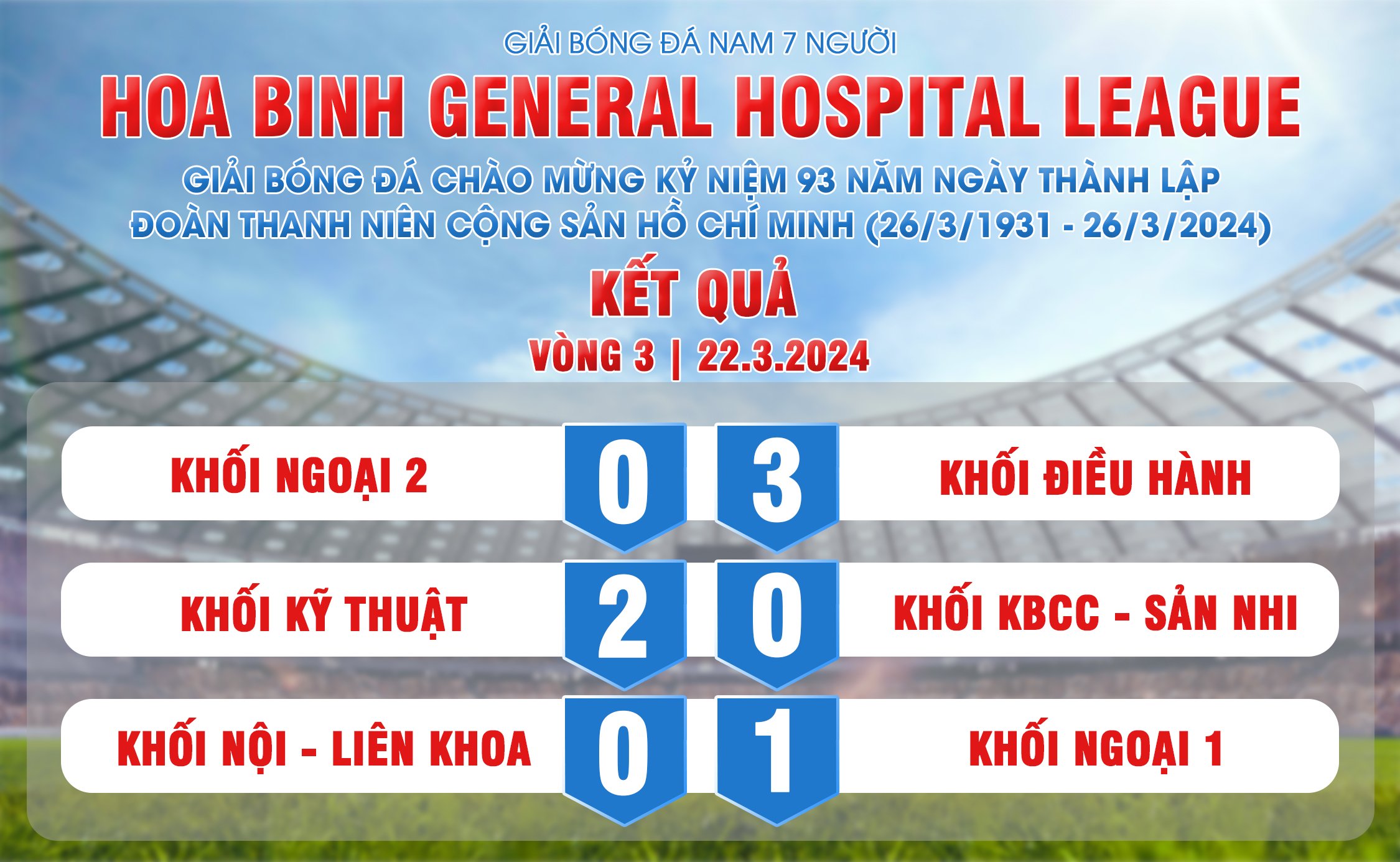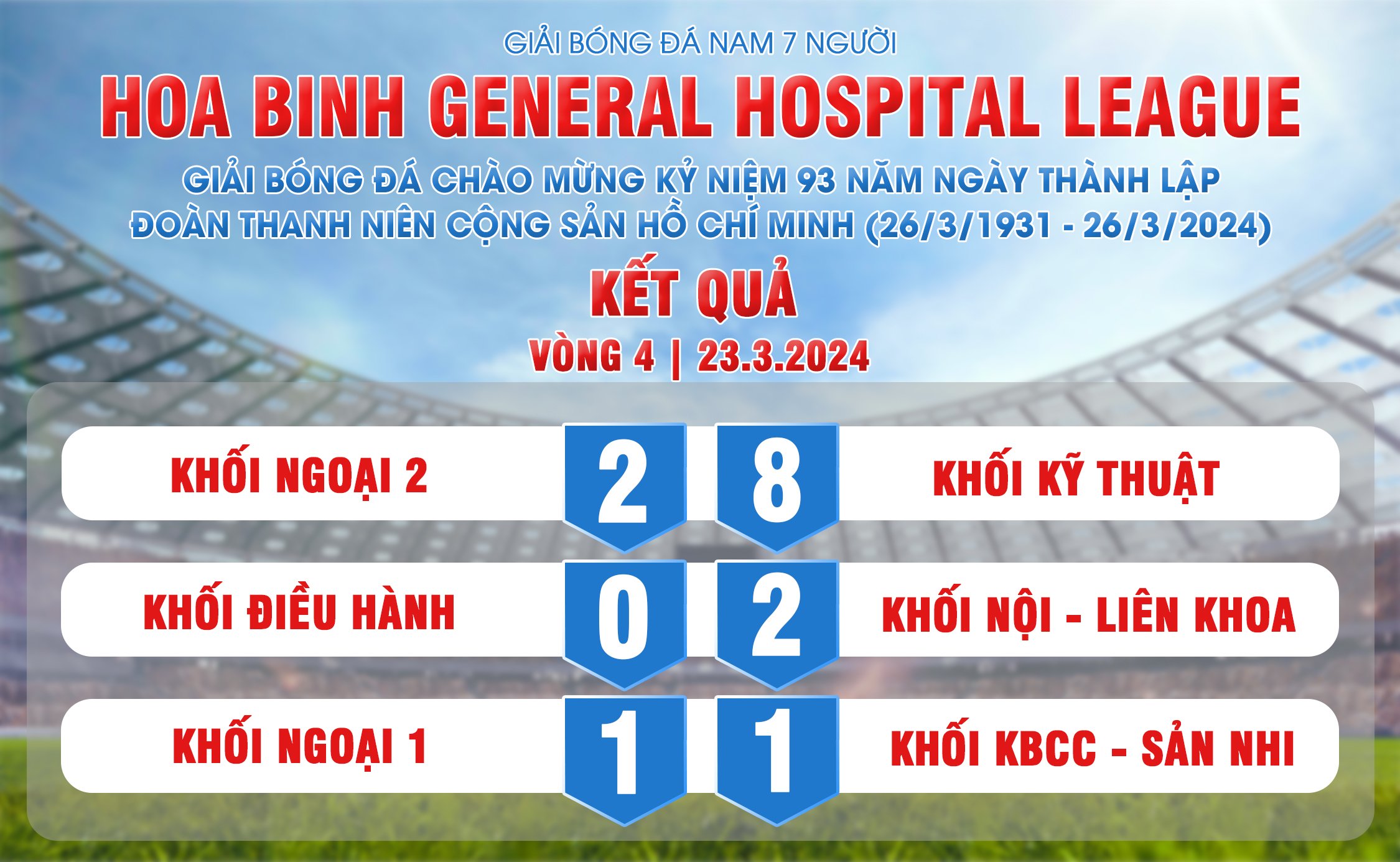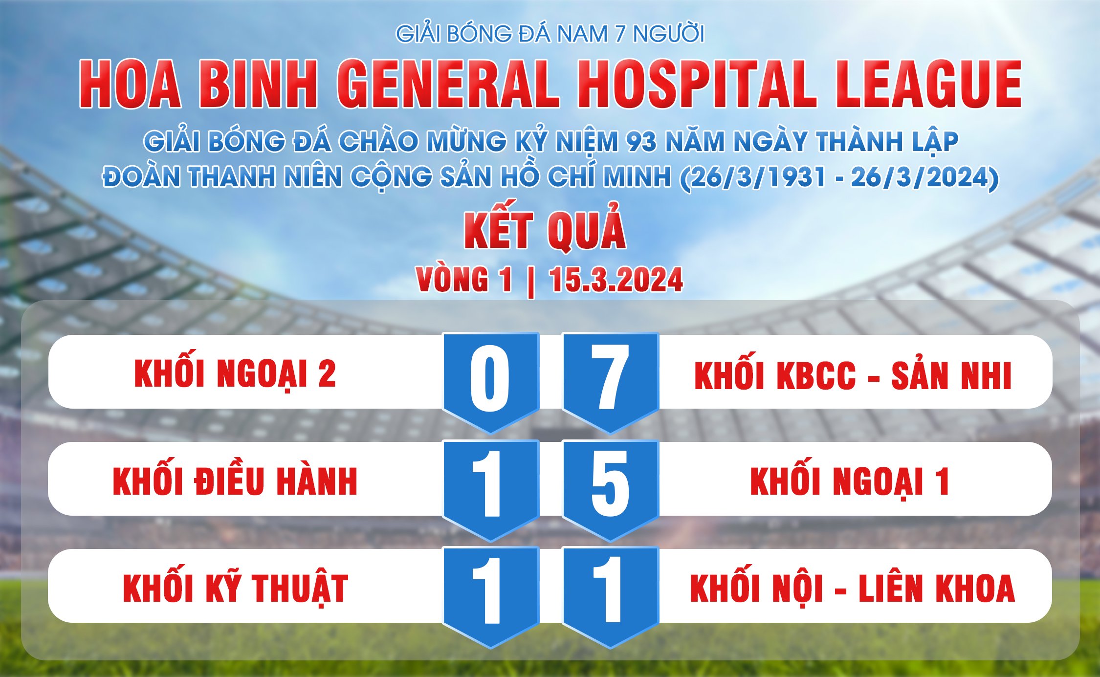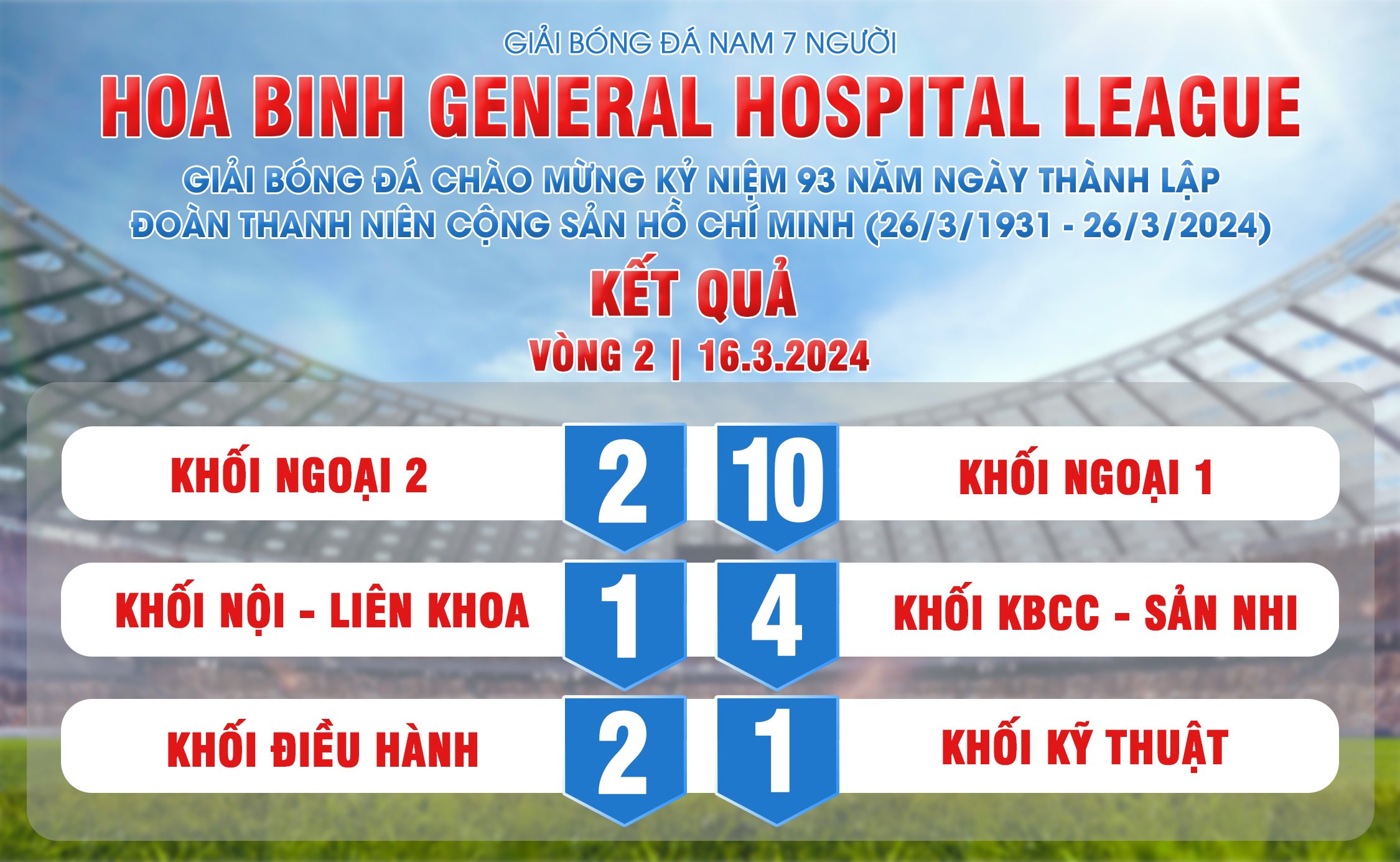 Đến hết ngày 24/3, Giải bóng đá nam “Hoa Binh general hospital league 2024” Bệnh viện Đa khoa tỉnh Hòa Bình đã trải qua 12 trận thi đấu trong khôn khổ giải. Đội bóng khối Ngoại 1 đang tạm dẫn đầu với 10 điểm. Trong đó có 3 trận thắng, 1 trận hòa