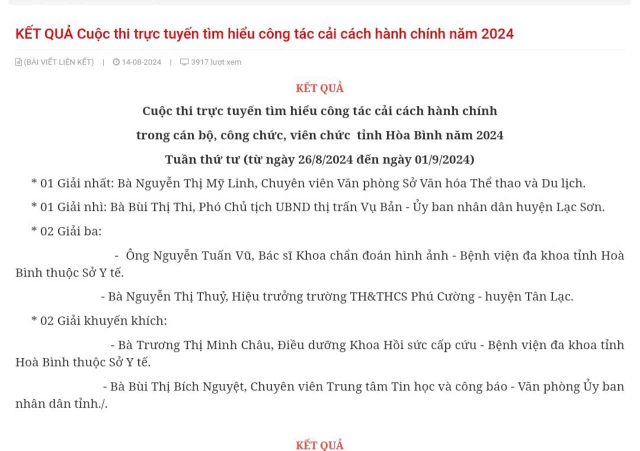Kết quả cuộc thi trực tuyến tìm hiểu công tác cải cách hành chính năm 2024 tuần 4 được đăng tải trên cổng thông tin Sở Nội vụ Hòa Bình