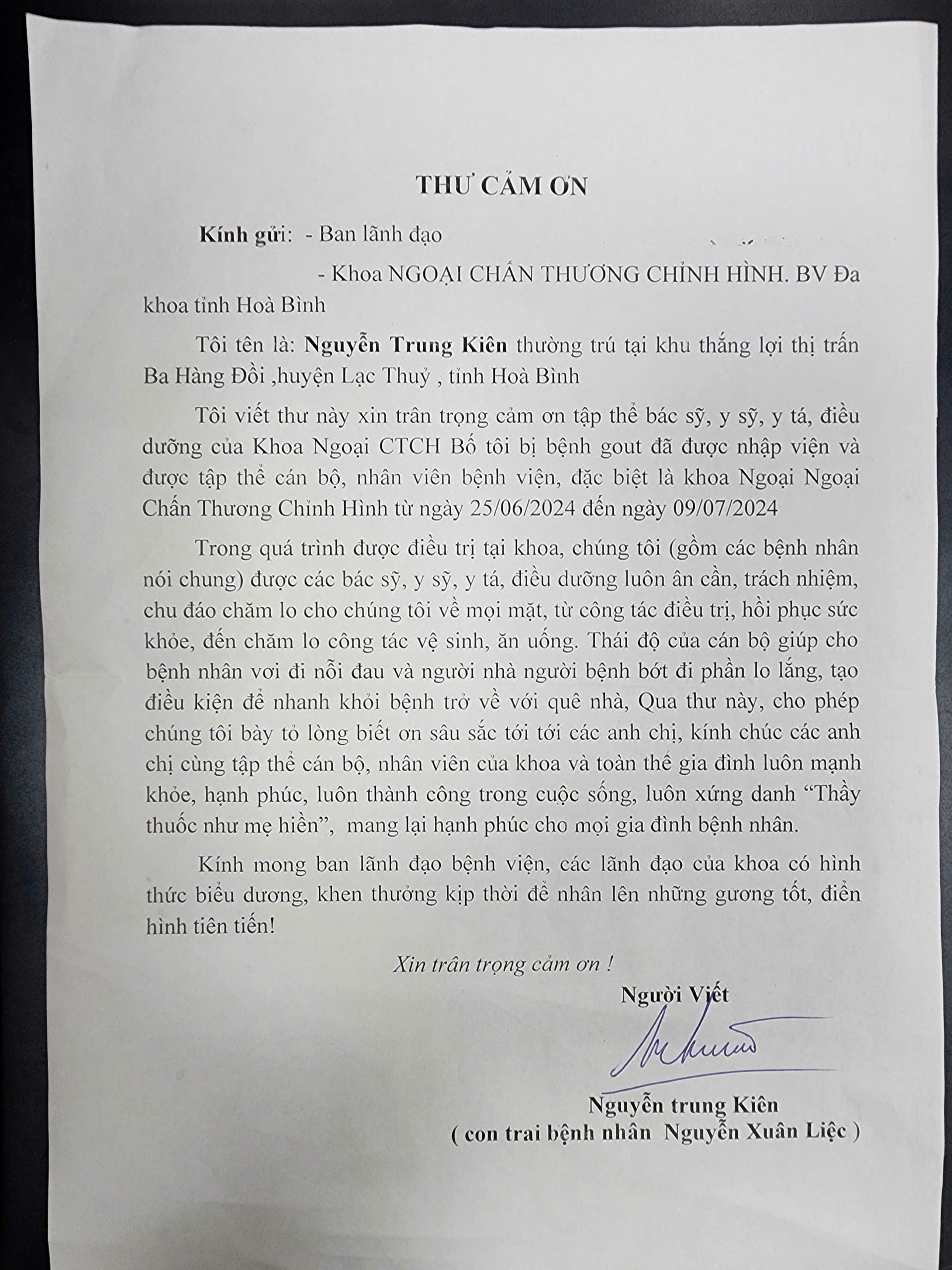 Tháng 7, tập thể khoa Ngoại Chấn thương – Chỉnh hình nhận được thư khen của người nhà người bệnh gửi từ huyện Lạc Thuỷ. Trong thư, người nhà người bệnh gửi lời cảm ơn trân trọng nhất tới tập thể cán bộ, y bác sĩ khoa Ngoại Chấn thương – Chỉnh hình. Trong quá trình điều trị tại khoa, các bệnh nhân luôn nhận được sự chăm sóc ân cần, trách nhiệm, chu đáo, chăm lo cho người bệnh mọi mặt, từ công tác điều trị, phục hồi, đến công tác vệ sinh, ăn uống: “Thái độ đó giúp cho bệnh nhân vơi đi nỗi đau và người nhà người bệnh bớt đi phần lo lắng, tạo điều kiện để nhanh khỏi bệnh trở về quê nhà” – Người nhà người bệnh viết.