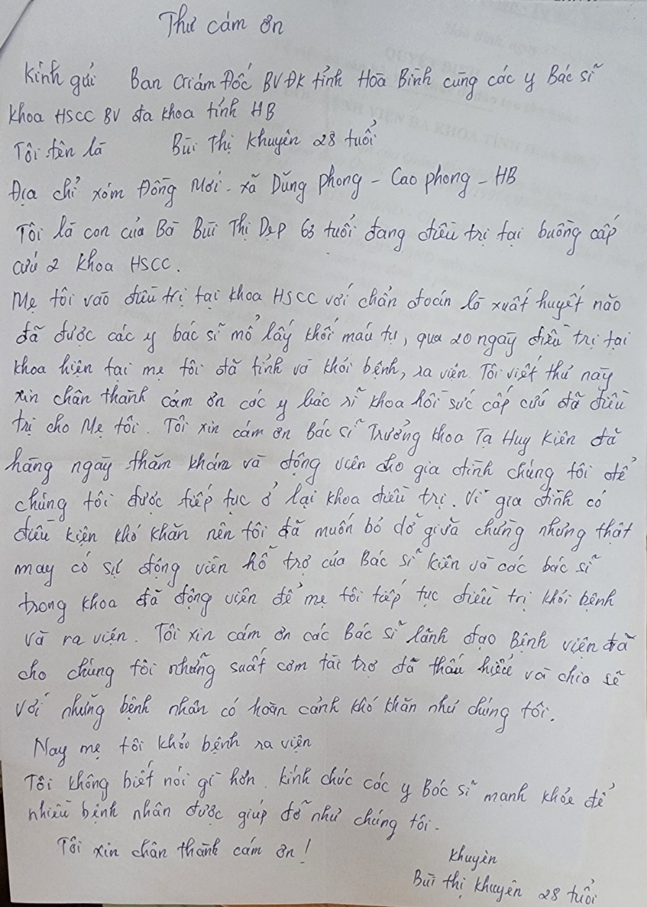 Vừa qua, khoa Hồi sức cấp cứu đã tiếp nhận cấp cứu và điều trị cho bệnh nhân B.T.D, 63 tuổi, Cao Phong, Hoà Bình. Bệnh nhân được cấp cứu, điều trị với chẩn đoán xuất huyết não, đã được các bác sĩ mổ lấy máu tụ. Qua 20 ngày điều trị và chăm sóc tại khoa Hồi sức cấp cứu, bệnh nhân đã được xuất viện trong tình trạng tỉnh táo, khoẻ mạnh. Trước thái độ chăm sóc tận tình, chu đáo, với trình độ, chuyên môn sâu và kinh nghiệm dầy dặn cứu sống người bệnh, khoa Hồi sức cấp cứu nhận được sự yêu thương, khâm phục và biết ơn của người bệnh với một lá thư cảm ơn nhiều xúc động.