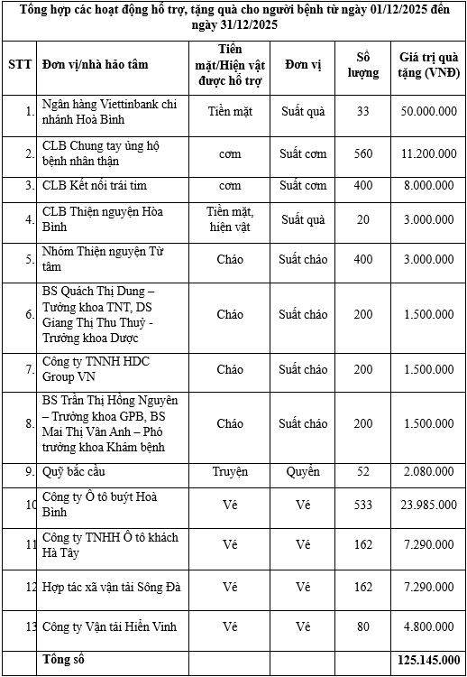 Với tinh thần “Kết nối yêu thương – Sẻ chia vì người bệnh”, trong tháng 12 năm 2025, Bệnh viện Đa khoa Hòa Bình đã vinh dự đón nhận sự quan tâm, đồng hành và hỗ trợ quý báu từ các cơ quan, đơn vị, tổ chức, doanh nghiệp và các nhà hảo tâm dành cho người bệnh có hoàn cảnh khó khăn đang điều trị tại bệnh viện. Những nghĩa cử nhân ái, kịp thời và đầy yêu thương đã góp phần động viên tinh thần, tiếp thêm nghị lực để người bệnh yên tâm điều trị, vượt qua khó khăn bệnh tật.