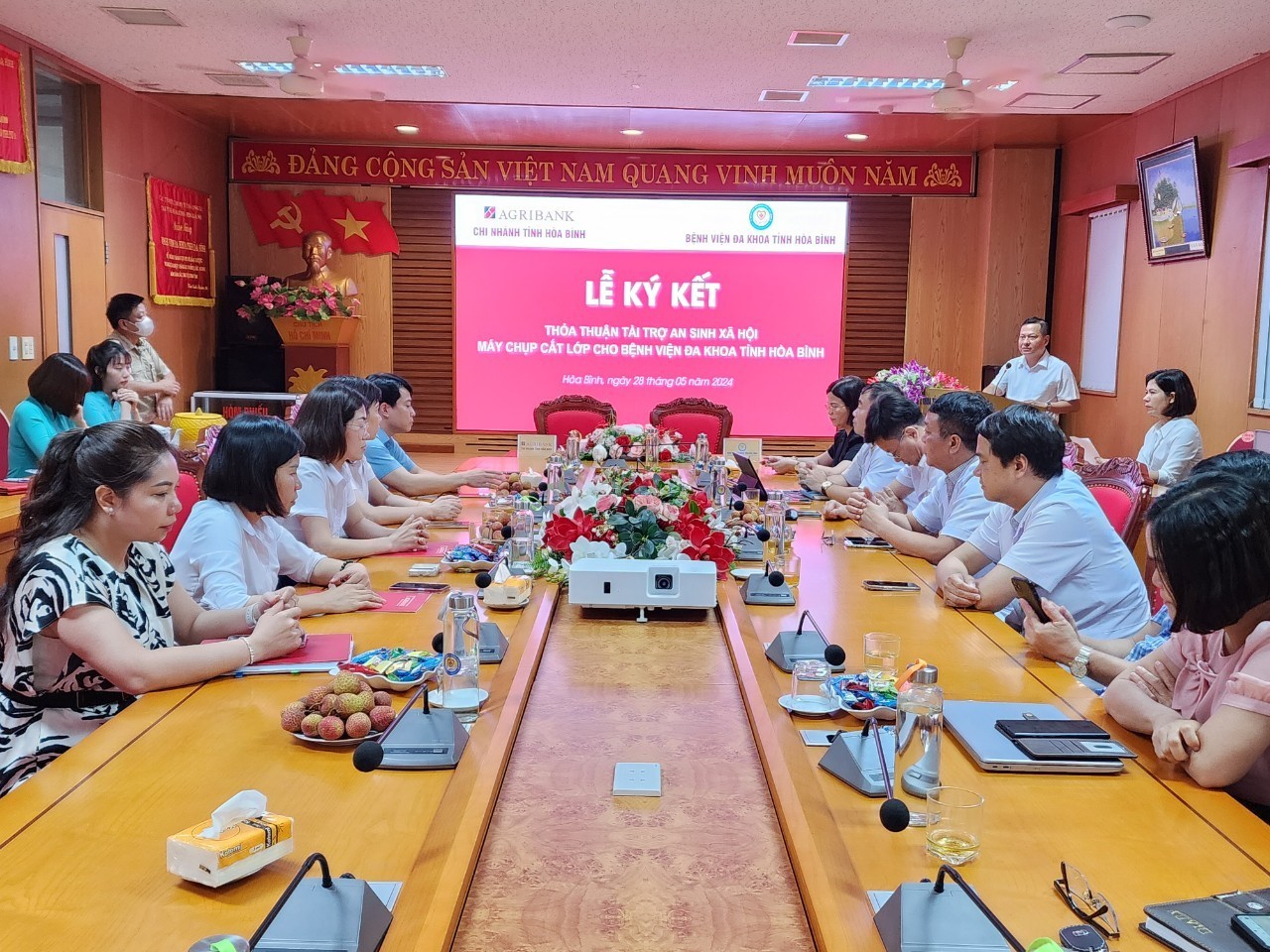 Ngày 28/5, Bệnh viện Đa khoa tỉnh Hòa Bình tổ chức Lễ ký kết thoả thuận tài trợ an sinh xã hội máy chụp cắt lớp vi tính giữa Bệnh viện Đa khoa tỉnh và Ngân hàng Nông nghiệp và Phát triển nông thôn chi nhánh tỉnh Hoà Bình. Tham dự có các đồng chí: Triệu Việt Anh, Chánh Văn phòng UB MTTQ VN tỉnh; Bùi Thu Hằng, Giám đốc Sở Y tế; Nguyễn Hữu Thắng, Phó Giám đốc Agribank Hòa Bình, Nguyễn Hoàng Diệu, Giám đốc Bệnh viện Đa khoa tỉnh và thành viên các đơn vị.