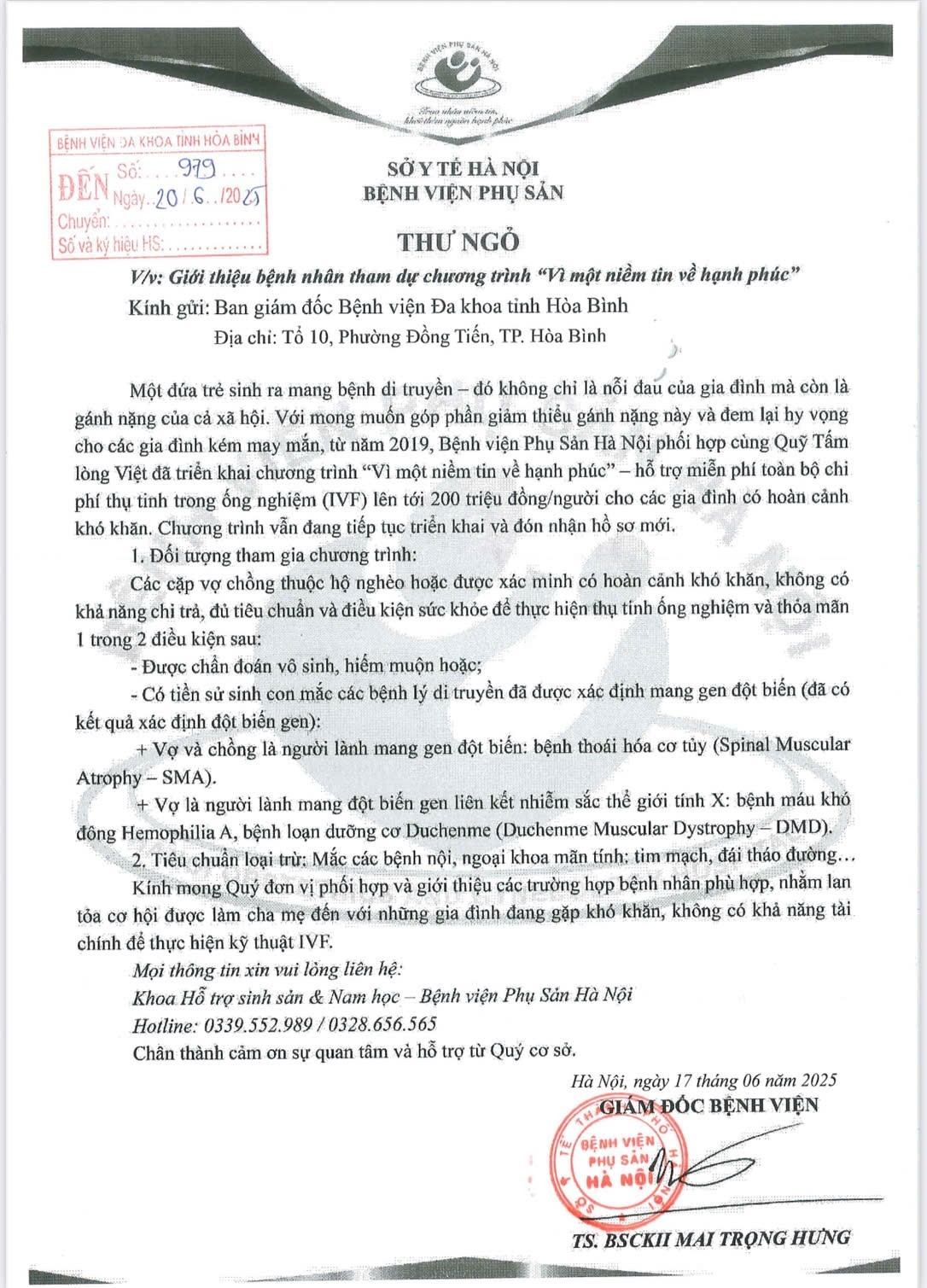 Vậy Bệnh viện Đa khoa Hoà Bình xin thông báo, gia đình nào thuộc các đối tượng nêu trên và có mong muốn được thụ tinh trong ống nghiệm xin vui lòng liên hệ: