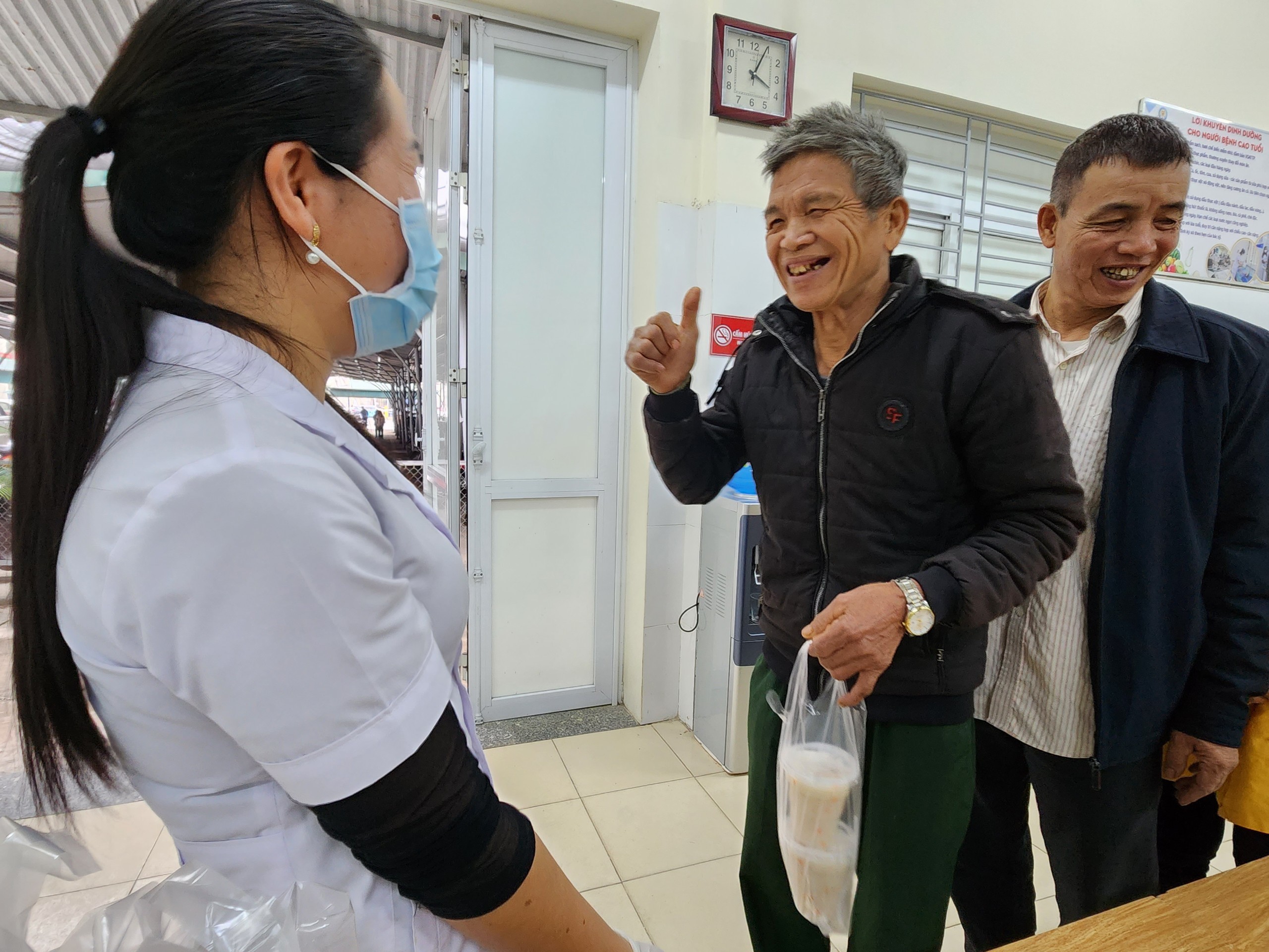 Chiều cùng ngày, khoa Dinh dưỡng tổ chức nấu và phát cháo thiện nguyện cho bệnh nhân điều trị nội trú tại Bệnh viện. Nồi cháo được góp sức bởi sự quan tâm của Giám đốc Bệnh viện, TS.BS Nguyễn Hoàng Diệu cũng như sự vào cuộc hỗ trợ trong công tác chuẩn bị của nhiều cán bộ các khoa, phòng.