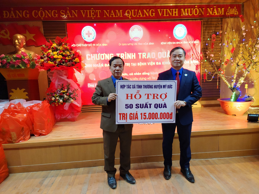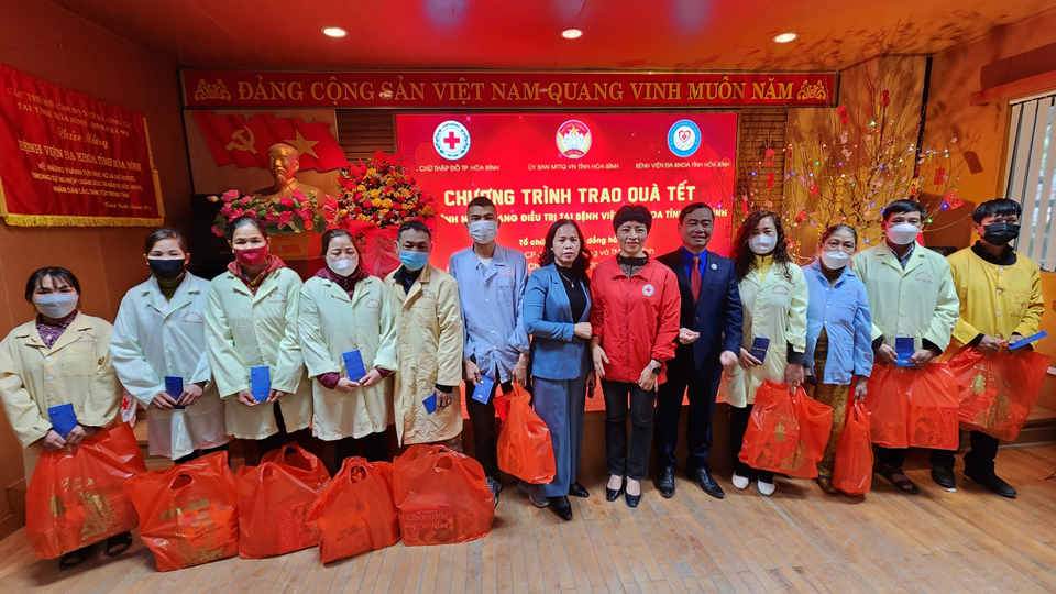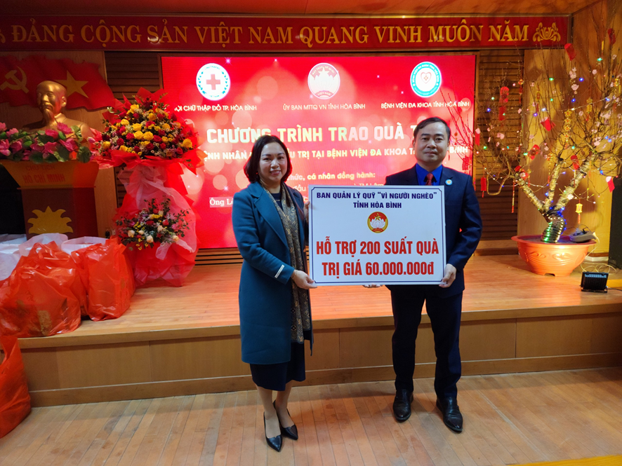 Theo đồng chí Đặng Bích Ngọc, Phó Chủ tịch TT Ủy ban MTTQ VN tỉnh, lần tặng quà này, Ủy Ban MTTQ VN tỉnh Hòa Bình có 200 suất. Hội Chữ thập đỏ thành phố cùng các nhà hảo tâm có 200 suất quà gửi tới các bệnh nhân và gia đình. Mỗi suất gồm một phần quà và một lì xì tiền mặt, tổng trị giá quà tặng là 155 triệu đồng. Đồng Chí Ngọc mong rằng, những món quà tuy nhỏ nhưng đong đầy tình cảm của các đồng chí lãnh đạo, các đơn vị và cá nhân hảo gửi gắm, mong bệnh nhân đón một Tết Quý mão vui vẻ, đầm ấm và mau chóng khỏi bệnh trở về với gia đình.