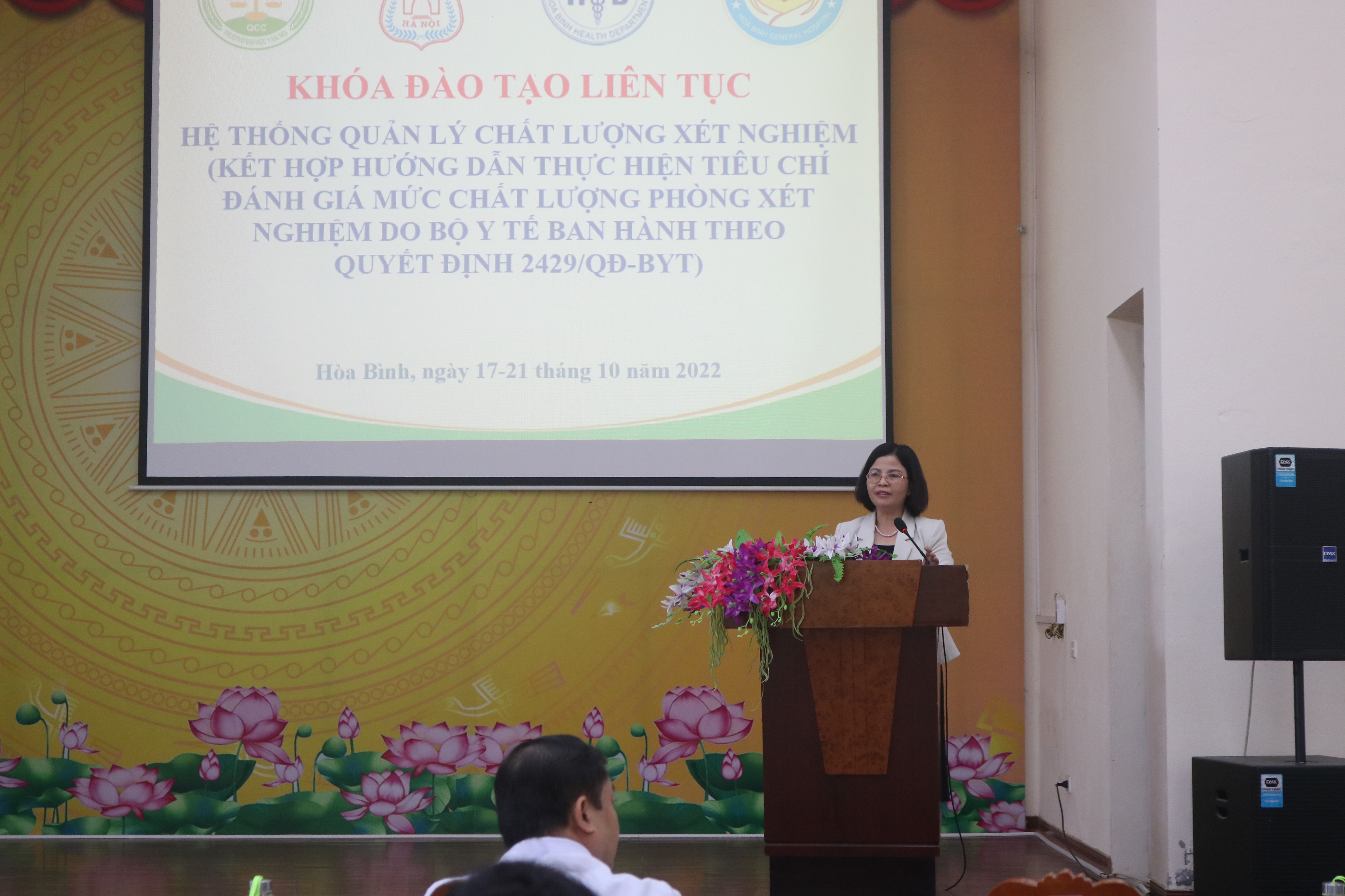 Phát biểu tại chương trình, BS.CKII Bùi Thu Hằng đánh giá, xét nghiệm đóng vai trò quan trọng trong chẩn đoán, điều trị và theo dõi sức khỏe người bệnh. Việc xây dựng hệ thống quản lý chất lượng theo Bộ tiêu chí đánh giá mức chất lượng phòng xét nghiệm y học của Bộ Y tế là một trong những mục tiêu quan trọng, nhằm cung cấp các dịch vụ xét nghiệm chính xác, đầy đủ, khách quan, tin cậy; tạo cơ sở liên thông kết quả giữa các phòng xét nghiệm, góp phần nâng cao chất lượng khám, chữa bệnh, giảm chi phí cho người bệnh. Qua đây, đồng chí Giám đốc Sở Y tế gửi lời cảm ơn sâu sắc đến lãnh đạo và thầy cô trường Đại học Y Hà Nội và mong rằng trong thời gian tới, trường sẽ có thêm nhiều chương trình đào tạo tiếp theo liên quan đến cải tiến và nâng cao chất lượng xét nghiệm cho ngành y tế Hoà Bình để các y, bác sĩ được học tập và đào tạo ngay tại tỉnh nhà.