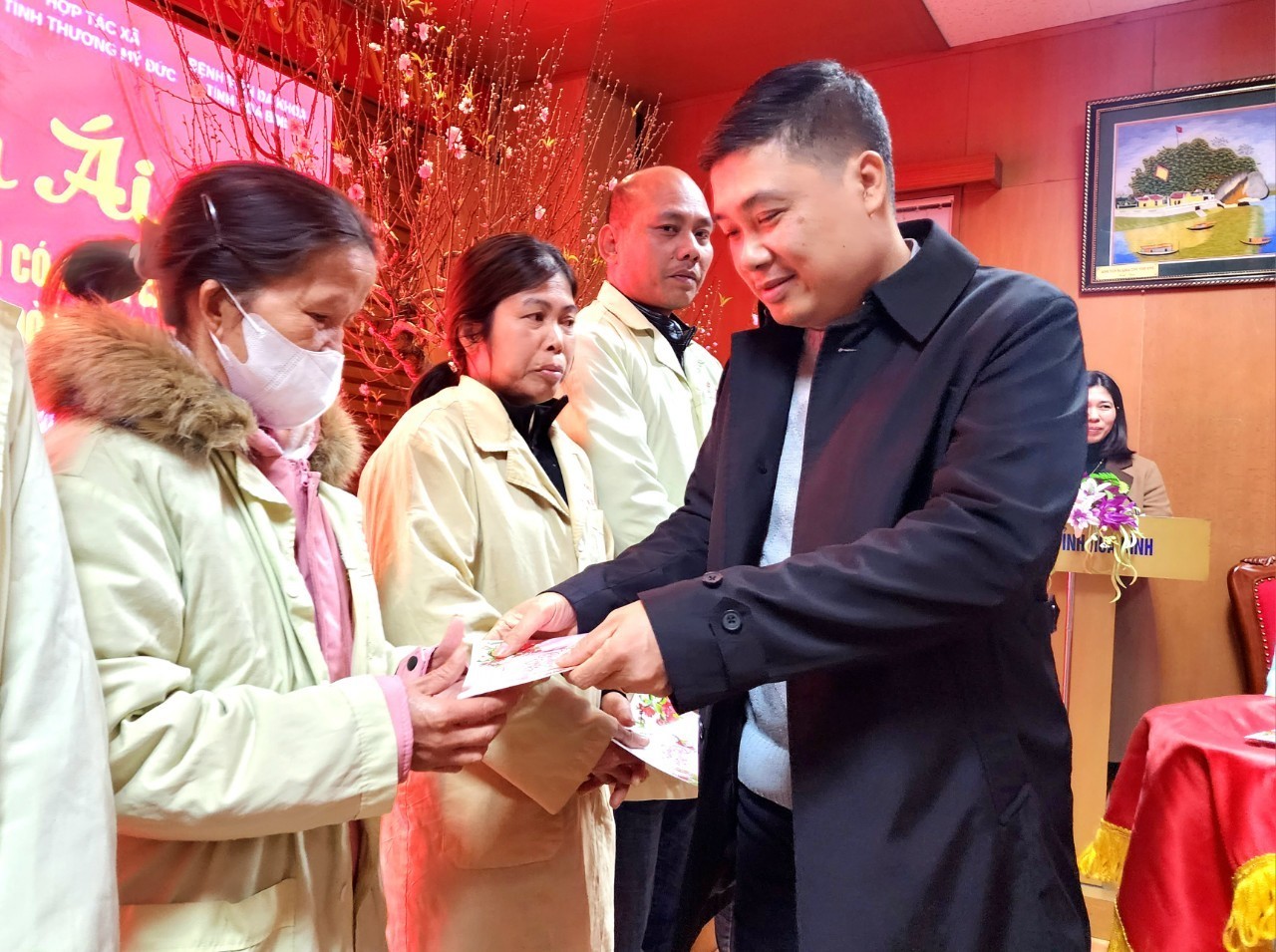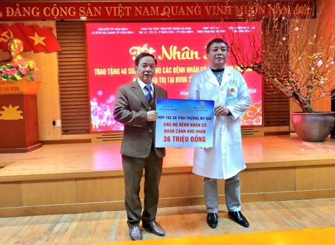 Ông Lê Hồng Mạnh, Giám đốc HTX Tình thương, huyện Mỹ Đức trao biểu trưng số tiền 36 triệu đồng hỗ trợ bệnh nhân khó khăn điều trị tại Bệnh viện