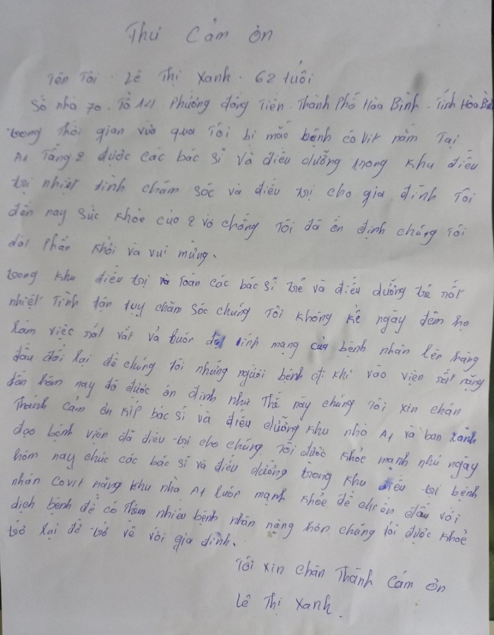 "Trong thời gian điều trị , các bác sĩ và điều dưỡng trẻ rất nhiệt tình tận tuỵ chăm sóc chúng tôi không kể ngày đêm. Họ làm việc rất vất vả, luôn đặt tính mạng của bệnh nhân lên hàng đầu đổi lại để chúng tôi, những người bệnh khi vào viện rất nặng đến hôm nay đã được ổn định như thế này". Đó là những lời cảm ơn bệnh nhân điều trị COVID-19 tại khu bệnh nhân nặng gửi tới y bác sĩ khu điều trị.