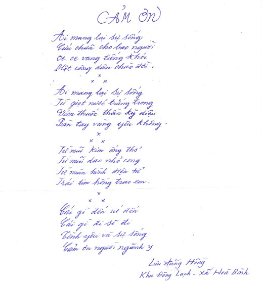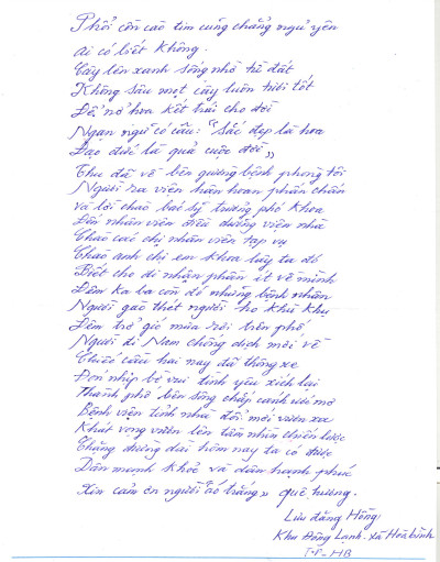 Ông Lưu Đăng Hồng, một người bệnh vừa điều trị khỏi tại khoa Lao, Bệnh viện Đa khoa tỉnh Hoà Bình vui mừng vì được đội ngũ y bác sĩ khoa Lao Bệnh viện chăm sóc tận tình, chu đáo. Ông cũng vui mừng vì sự phát triển và đổi thay ngày càng tích cực của Bệnh viện Đa khoa tỉnh, không chỉ về cơ sở vật chất và còn về thái độ chuyên nghiệp, chu đáo của cán bộ nơi đây. Sau một thời gian nằm viện và được điều trị khỏi, ông có loạt ba bài thơ gửi lời cảm ơn, lời khen tặng tới tập thể khoa Lao nói riêng và Bệnh viện Đa khoa tỉnh Hoà Bình nói chung.