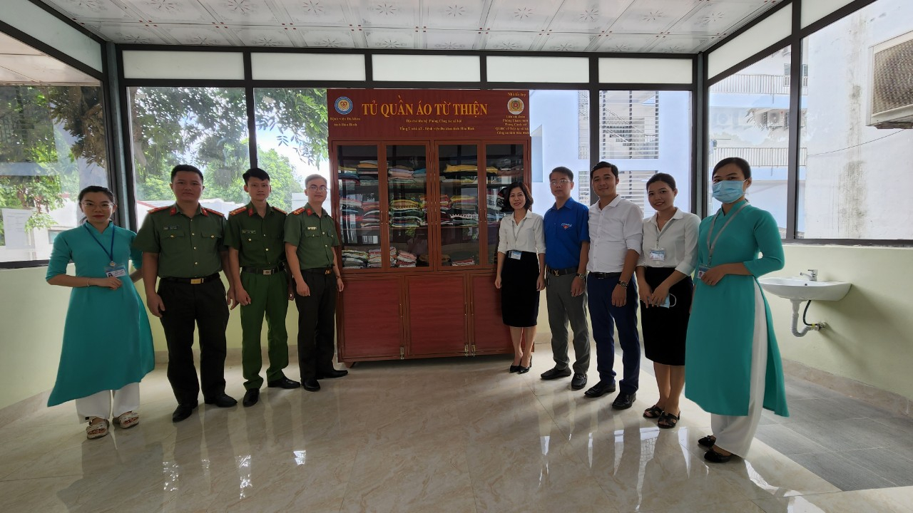 Các đại diện Bệnh viện, Công an tỉnh bên tủ quần áo từ thiện đặt tại nhà thiện nguyện Bệnh viện