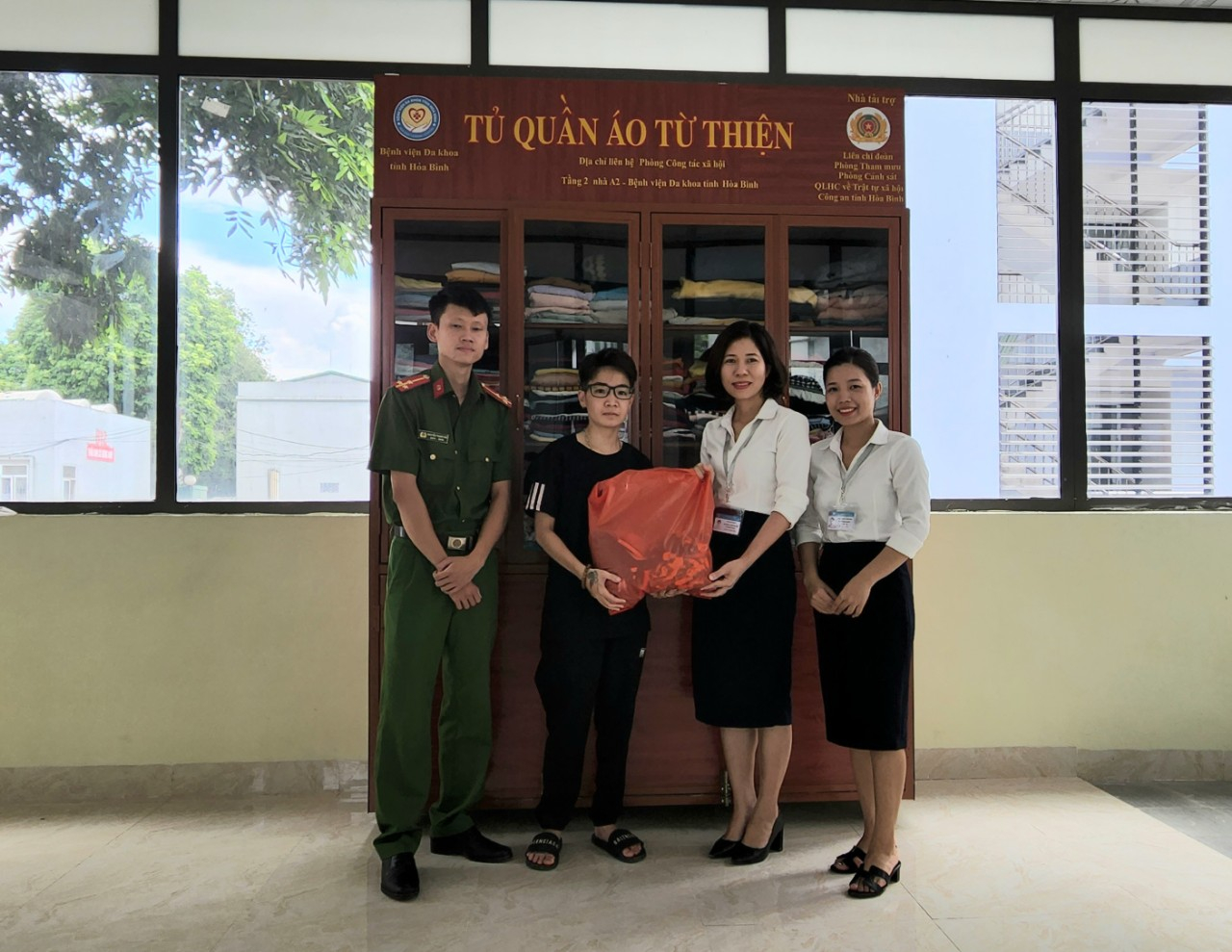 Trong những năm qua, các hoạt động hướng về người bệnh với phương châm “điều trị bằng khoa học, chăm sóc bằng trái tim” luôn được lãnh đạo và cán bộ Y tế Bệnh viện Đa khoa tỉnh đặc biệt quan tâm. Bằng nhiều hình thức rất đa dạng, phong phú, người bệnh khi đến khám và điều trị tại Bệnh viện, nhất là bệnh nhân có hoàn cảnh khó khăn, bệnh nhi, người yếu thế, neo đơn đều được động viên tinh thần từ công tác thiện nguyện, như những suất cơm hỗ trợ hàng ngày, tới đồ dùng, sinh hoạt, tiền hỗ trợ điều trị... Đến nay, các hoạt động thiện nguyện đã trở thành nguồn động viên rất lớn với người bệnh có hoàn cảnh khó khăn tại Bệnh viện đa khoa tỉnh. Hưởng ứng lời kêu gọi của Phòng Công tác xã hội, Bệnh viện đa khoa tỉnh Hoà Bình Đoàn thanh niên Liên chi đoàn Phòng Tham mưu, Phòng QLHC về trật tự xã hội Công an tỉnh, nhà hảo tâm Nguyễn Thị Tuyết Mai, Việt kiều Mỹ đã tặng cho Bệnh viện Tủ quần áo để trưng bày và phát cho các bệnh nhân có hoàn cảnh khó khăn. … Tổng giá trị tủ và quần áo mua mới làm từ thiện trị giá 8,5 triệu đồng.