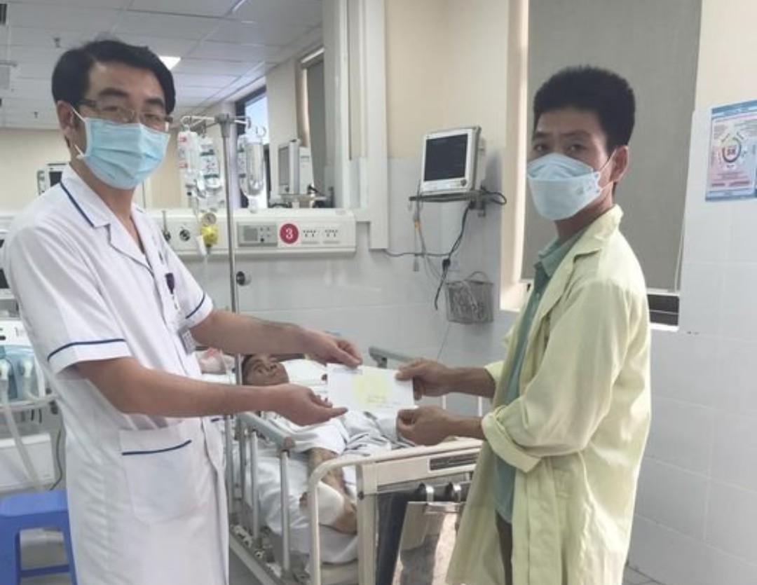 Cán bộ y tế khoa Hồi sức tích cực thay mặt các nhà hảo tâm trao hỗ trợ đến người nhà bệnh nhân Đinh Công Chung