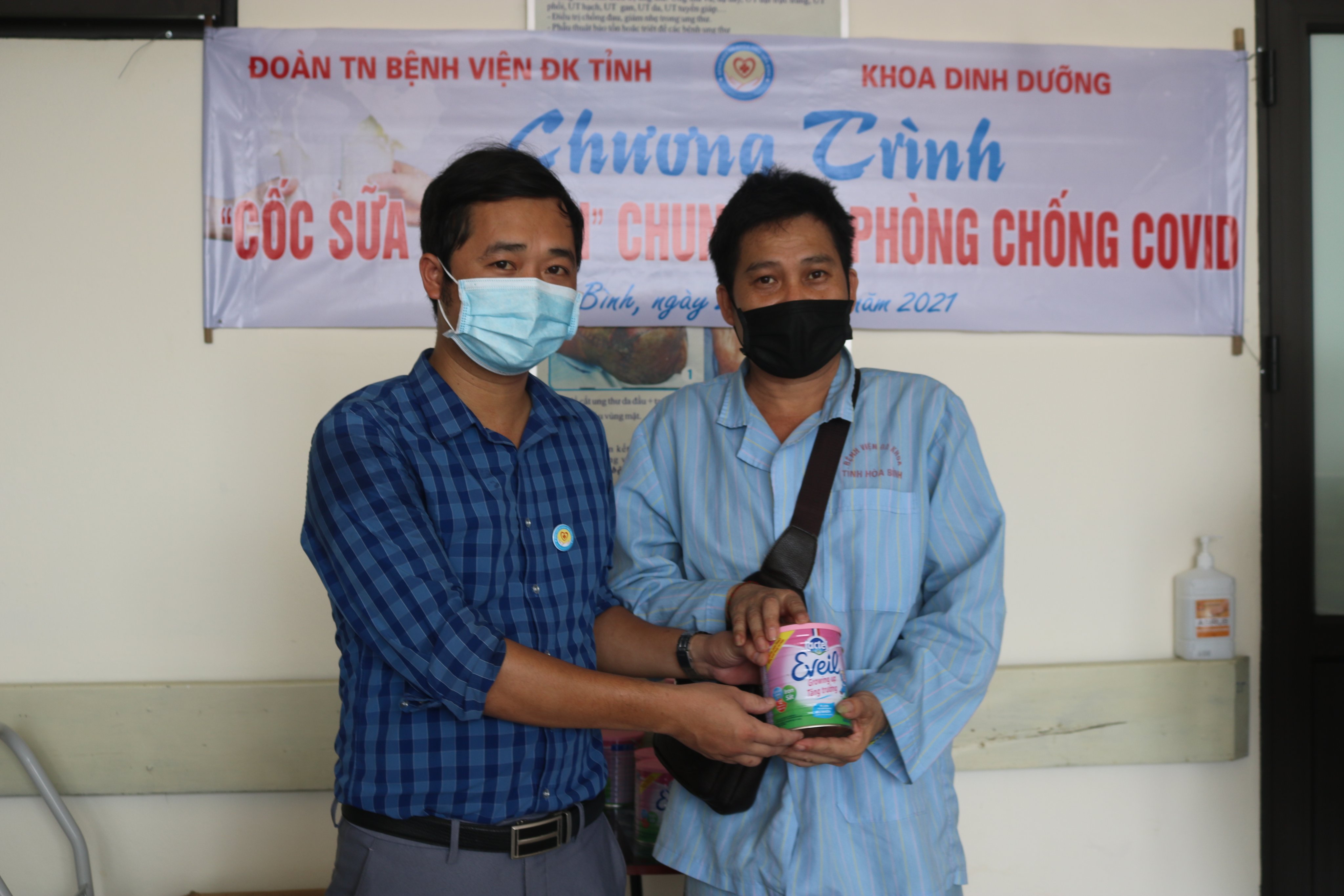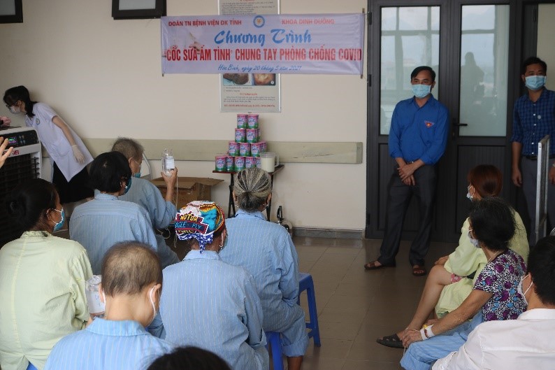 Được sự hỗ trợ của Đoàn Thanh niên văn phòng Tỉnh uỷ, ngày 20/5, Đoàn Thanh niên Bệnh viện Đa khoa tỉnh phối hợp với khoa Dinh dưỡng tổ chức chương trình “Cốc sữa ấm tình chung tay phòng chống dịch Covid-19”. Tham dự có đồng chí Nguyễn Đính, Bí thư Đoàn thanh niên Bệnh viện Đa khoa tỉnh, đại diện khoa Dinh dưỡng và bệnh nhân, người nhà bệnh nhân tại khoa Ngoại Thần kinh - Ung bướu, Bệnh viện Đa khoa tỉnh.