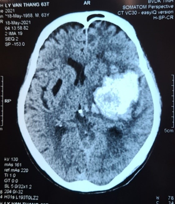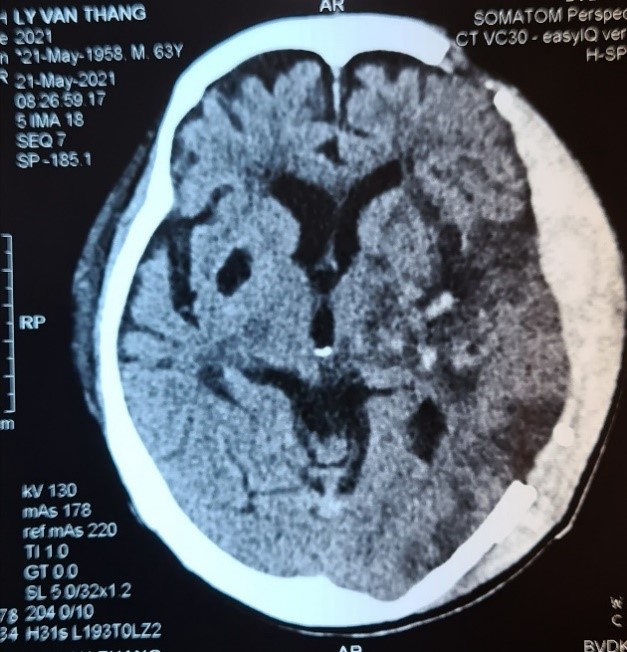 Bệnh nhân Lý Văn T. (63 tuổi) đột ngột xuất hiện tình trạng đau đầu, bất tỉnh được gia đình cấp cứu tại cơ sở rồi chuyển đến Bệnh viện Đa khoa tỉnh Hòa Bình. Lúc vào viện bệnh nhân trong tình trạng hôn mê Glassgow 9 điểm, thở khò khè, liệt nửa người phải, huyết áp 190/100mmHg. Kết quả chụp cắt lớp cho thấy hình ảnh chảy máu não vị trí nhân nền thái dương trái đè đẩy đường giữa nhiều, phù não xung quanh. Bệnh nhân đã được làm các xét nghiệm, hội chẩn cấp cứu các chuyên ngành Hồi sức cấp cứu, Ngoại Thần kinh với tình trạng xuất huyết não khối lượng lớn, chèn ép não nhiều cần phẫu thuật cấp cứu lấy máu tụ, cầm máu và giải áp não.