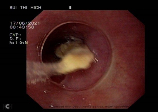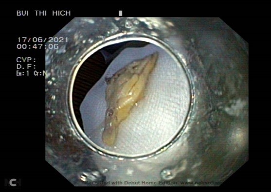 Qua thăm khám lâm sàng, chụp Xquang, các bác sĩ xác định có dị vật mắc ở thực quản đoạn cổ và ngực. Kíp thực hiện can thiệp chính gồm Bs.CKI Nguyễn Thị Thanh Hảo, phó trưởng khoa Nội Tổng hợp và các thành viên đã thực hiện tiến hành thủ thuật nội soi can thiệp gắp dị vật. Kìm chuyên dụng được sử dụng để gắp dị vật nhanh chóng sau 10 phút. Dị vật là mảnh xương gà lẫn thịt có hình tam giác, kích thước 2x1,5x1,5 cm, dị vật có 2 đầu nhọn, cắm vào thành thực quản, gây chảy máu. Sau khi gắp dị vật, nội soi kiểm tra lại thực quản có vết rách nông đoạn 1/3 trên kích thước 0,5 cm và không còn chảy máu. Người bệnh được theo dõi tại khoa khám bệnh, ổn định và ra viện trong ngày.