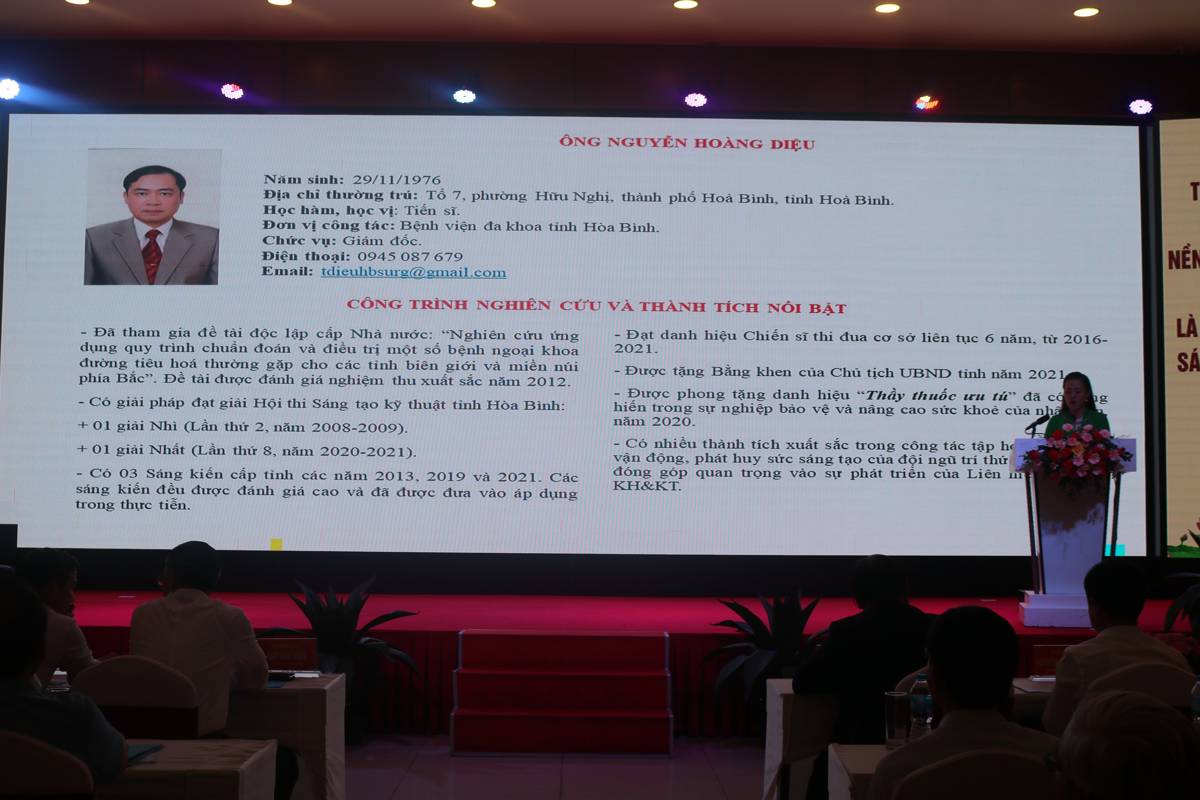 Ngày 13/5, UBND tỉnh Hoà Bình long trọng tổ chức Lễ tôn vinh trí thức khoa học công nghệ tiêu biểu tỉnh Hoà Bình lần thứ I, năm 2022. Đồng chí Ngô Văn Tuấn, Ủy viên BCH TƯ Đảng, Bí thư tỉnh ủy, Trưởng đoàn Đại biểu Quốc hội tỉnh Hoà Bình dự và chủ trì buổi lễ. Tham dự còn có lãnh đạo UBND tỉnh, Ban Tuyên giáo Tỉnh ủy, các sở, ngành, cơ quan, đoàn thể, lãnh đạo các Hội, ban ngành trong tỉnh và 20 đại biểu là các trí thức khoa học công nghệ tiêu biểu tỉnh Hoà Bình năm 2022. Đồng chí Phan Xuân Dũng, Bí thư Đảng đoàn, Chủ tịch Hội liên hiếp các Hội KH&KT Việt Nam dự và phát biểu chúc mừng. Bệnh viện Đa khoa tỉnh Hoà Bình vinh dự có 02 trí thức được tham dự và tôn vinh gồm: TS.BS Nguyễn Hoàng Diệu, Giám đốc Bệnh viện và TS.BS Trương Như Hiển, Phó Giám đốc Bệnh viện.