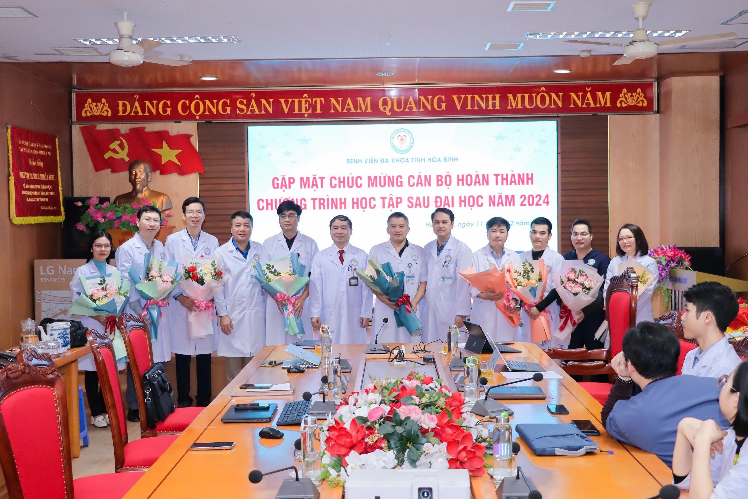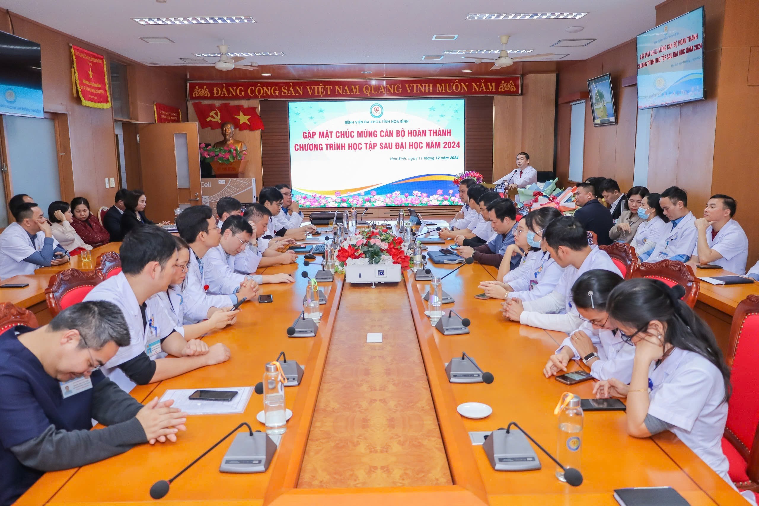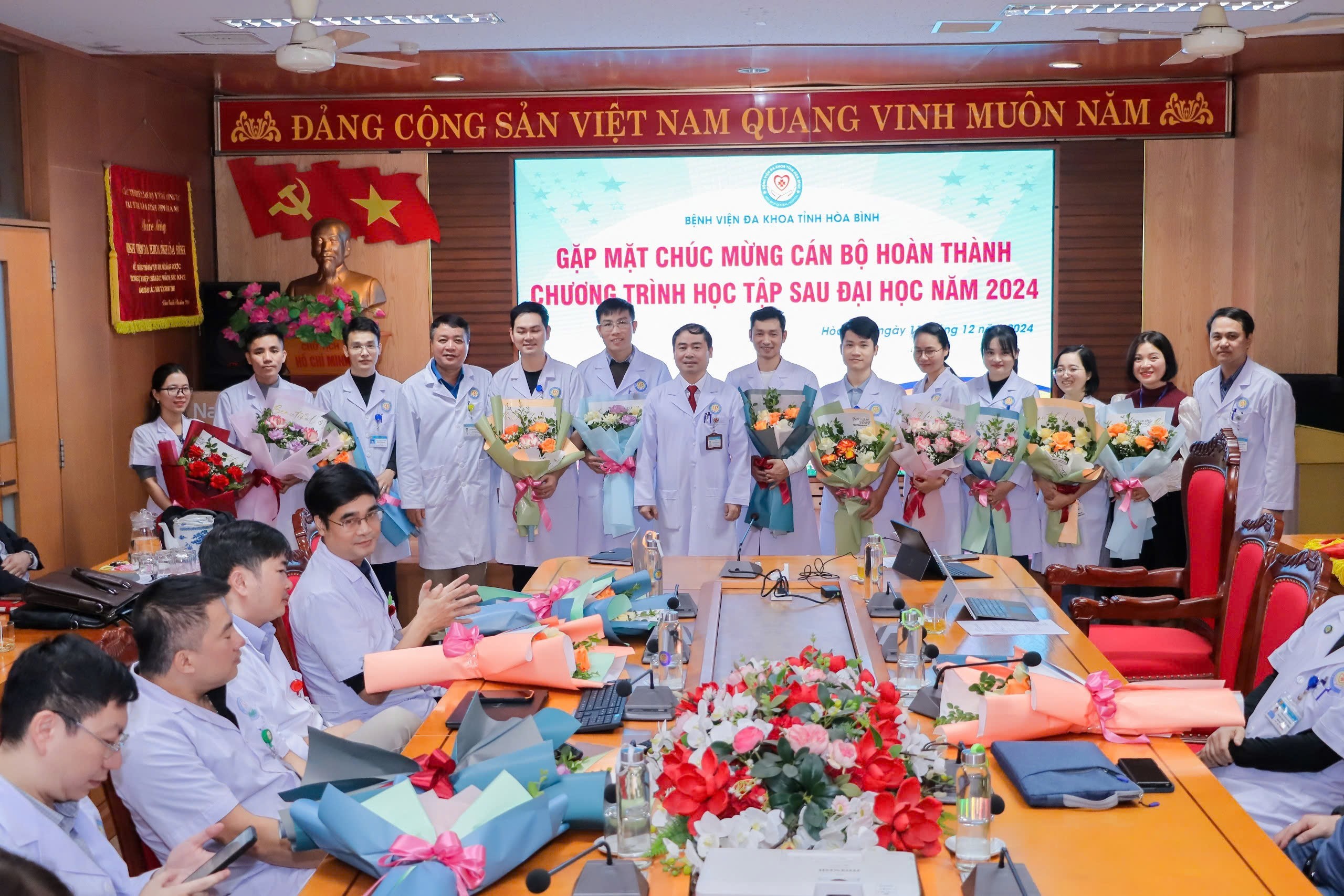 Ngày 11/12, Bệnh viện Đa khoa tỉnh Hòa Bình tổ chức chương trình Gặp mặt chúc mừng cán bộ hoàn thành chương trình học tập sau đại học năm 2024. TTƯT.TS.BS Nguyễn Hoàng Diệu, Bí thư Đảng ủy, Giám đốc Bệnh viện dự và chúc mừng các cán bộ hoàn thành chương trình học sau đại học.