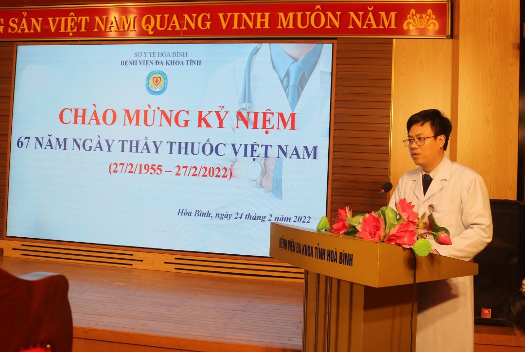 Sáng 24/2, Bệnh viện Đa khoa tỉnh Hoà Bình tổ chức Lễ kỷ niệm ôn lại truyền thống Ngày Thầy thuốc Việt Nam 27/2. TS.BS Nguyễn Hoàng Diệu, Bí thư Đảng ủy, Giám đốc Bệnh viện dự và động viên chương trình.