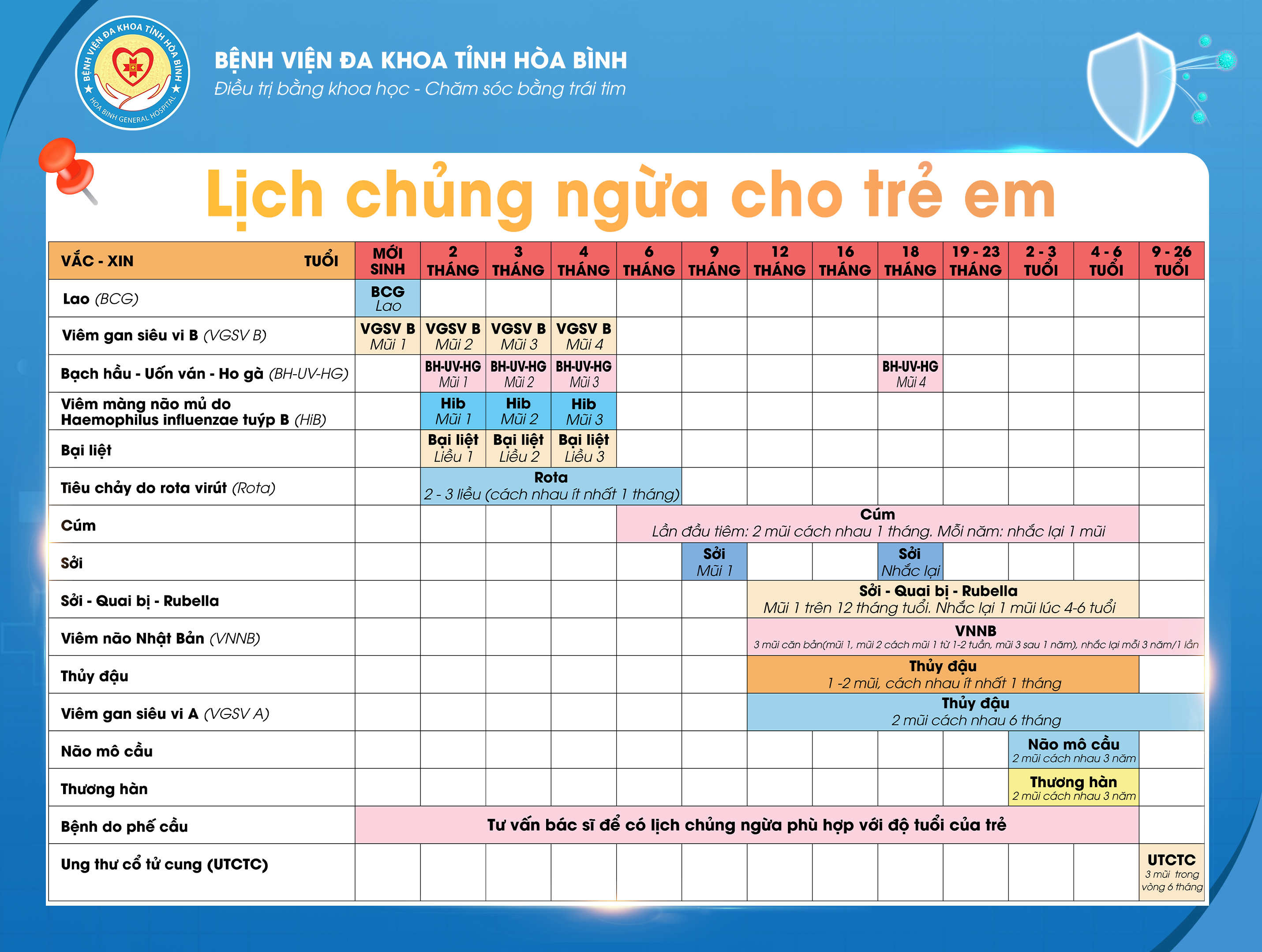 Theo đó, đây là mô hình được Bệnh viện Đa khoa tỉnh Hoà Bình đầu tư chuyên môn sâu với chất lượng cao, đảm bảo an toàn và hiệu quả. Phòng tiêm chủng được Bệnh viện trang bị cơ sở vật chất hiện đại, trang trọng, có khả năng cung ứng đầy đủ các loại vắc xin, sinh phẩm cho đối tượng Nhi khoa từ 0-16 tuổi bao gồm: Lao, Viêm gan siêu vi B, Bạch hầu – Ho gà – Uốn ván, Viêm màng não mủ, Bại liệt, Tiêu chảy do Rota virut, Cúm, Sởi, Sởi – Quai bị - Rubella, Viêm não Nhật Bản, Thuỷ đậu, Viêm gan siêu vi A, Não mô cầu, Thương hàn, Bệnh do phế cầu, Ung thư cổ tử cung. Bên cạnh đó, đội ngũ nhân viên y tế là các Bác sĩ có chuyên môn cao, kinh nghiệm dày dặn sẽ là các chuyên gia tư vấn đầy đủ cho người dân cũng như xử lý kịp thời những sự cố sau tiêm nếu có.