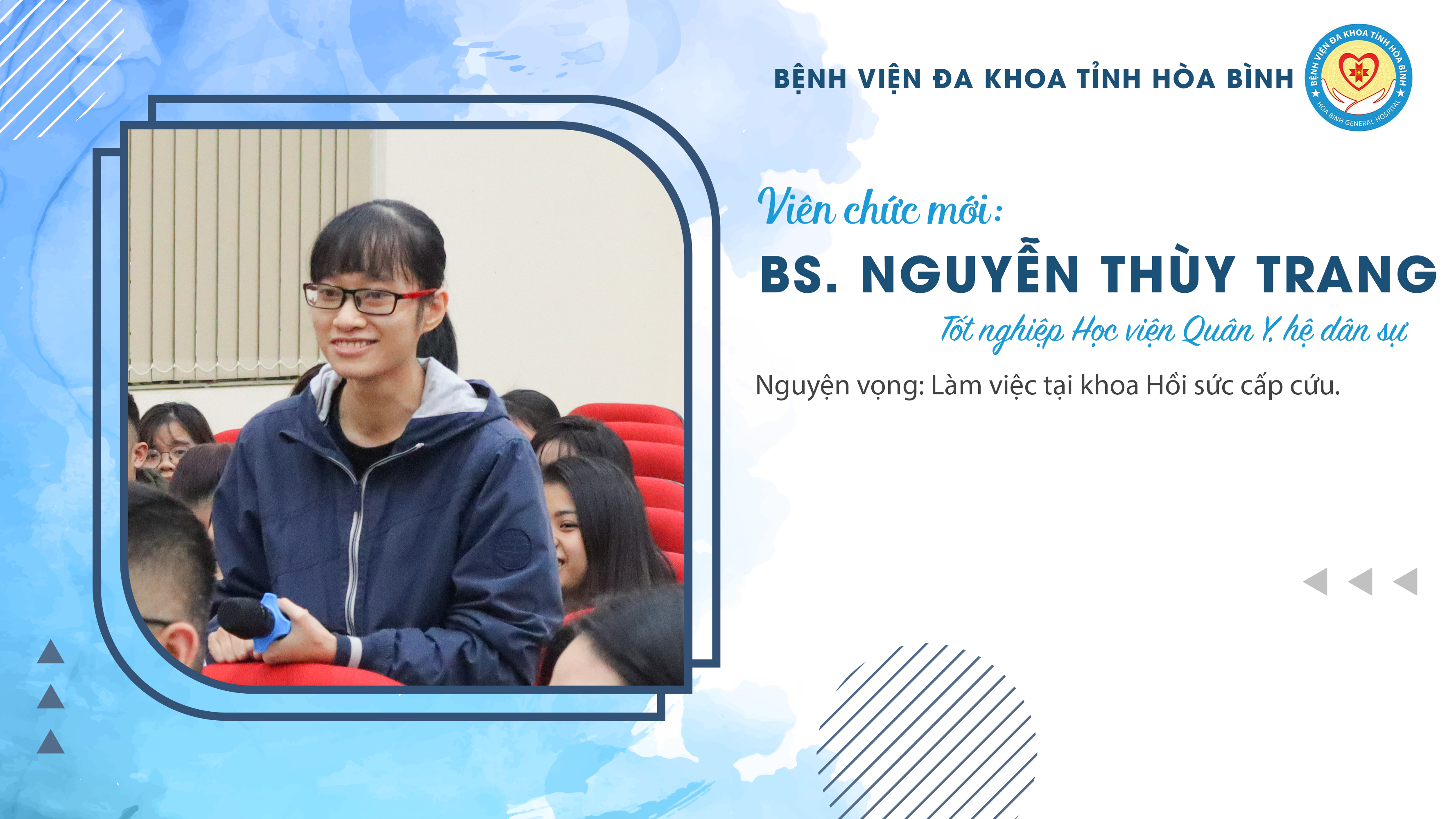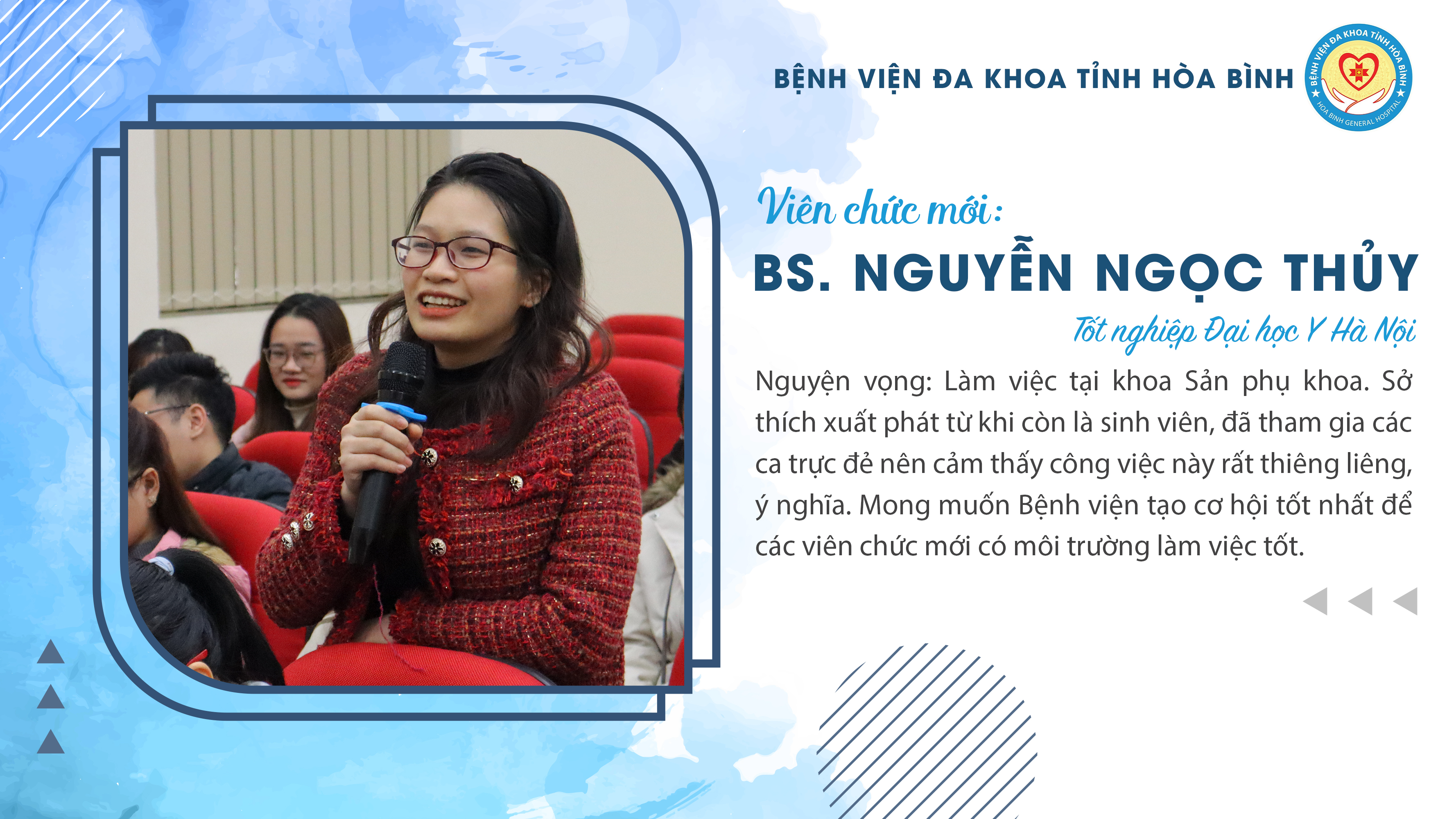 Tại chương trình gặp mặt, Thầy thuốc ưu tú, TS.BS Nguyễn Hoàng Diệu, Giám đốc Bệnh viện nhiệt liệt chào mừng các viên chức mới về ngôi nhà chung Bệnh viện Đa khoa tỉnh Hoà Bình. Đồng chí Giám đốc Bệnh viện cho biết, Bệnh viện Đa khoa tỉnh là Bệnh viện hạng I trực thuộc sở Y tế, là đơn vị y tế tuyến cuối của tỉnh với nhiều khoa phòng có lĩnh vực hoạt động chuyên môn sâu. Bệnh viện đang trên đà phát triển và trong tương lai sẽ còn phát triển hơn nữa. Vì vậy, công tác tuyển dụng nhân sự cũng như đào tạo nâng cao trình độ cho cán bộ rất được bệnh viện quan tâm chú trọng. Việc tuyển dụng các viên chức mới năm 2022 là cơ hội không chỉ cho các viên chức mới, mà còn là cơ hội để Bệnh viện Đa khoa tỉnh ngày càng phát triển lớn mạnh hơn, với đội ngũ nhân sự hùng hậu hơn. Tuy nhiên, đồng chí Giám đốc Bệnh viện cũng không quên nhắc nhở các viên chức mới về những khó khăn, vất vả mà các viên chức mới sẽ cần phải bản lĩnh, vừng vàng và kiên định để vượt qua. Đồng thời, xác định tư tưởng, xây dựng kế hoạch, lộ trình phát triển của cá nhân gắn liền với sự phát triển của khoa, phòng nơi mình công tác và cả với sự phát triển của Bệnh viện. Cuối cùng, đồng chí Giám đốc cũng gửi lời động viên tới các viên chức mới, trong sự nghiệp của các viên chức mới luôn có sự đồng hành, hỗ trợ, giúp đỡ từ Ban Giám đốc, các khoa phòng và các đồng nghiệp.